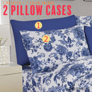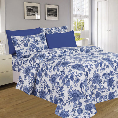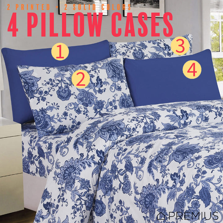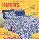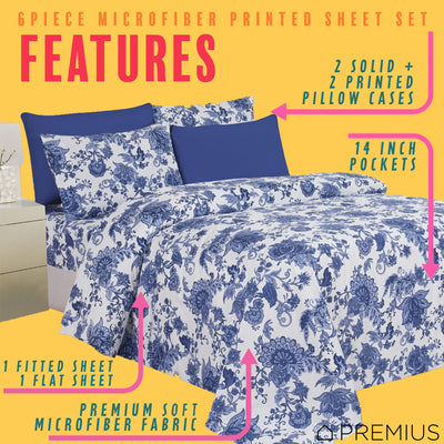 Effortlessly eliminate the need for ironing and welcome seamless sophistication. This innovative wrinkle-free set consistently displays a flawless, unblemished surface, ensuring your bedding remains pristine and attractive day after day. Ingeniously designed with generous 14-inch deep pockets, the fitted sheet fits snugly and securely onto various mattress depths, always maintaining a taut and impeccably neat presentation. This complete six-piece collection (or four-piece for Twin) includes a flat sheet for an elegant drape, a fitted sheet for an impeccable foundation, two distinctively printed pillowcases highlighting the beautiful floral imagery, and two solid blue-colored pillowcases that provide a complementary accent (1 printed and 1 solid for twin).
