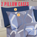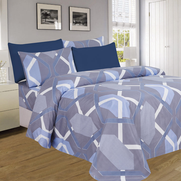 Effortlessly banish wrinkles and welcome seamless sophistication. This innovative wrinkle-free set consistently displays a flawless, unblemished surface, ensuring your bedding remains pristine and attractive day after day. Ingeniously designed with generous 14-inch deep pockets, the fitted sheet fits snugly and securely onto various mattress depths, always maintaining a taut and impeccably neat presentation. This complete six-piece collection (or four-piece for Twin) includes a flat sheet for an elegant drape, a fitted sheet for an impeccable foundation, two distinctively printed pillowcases highlighting the striking geometric design, and two solid dark blue-colored pillowcases that perfectly complement the overall aesthetic (1 printed and 1 solid for twin).