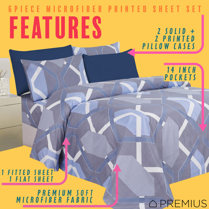 Refresh your sleep haven with the PREMIUS Premium Collection Lyinks 6-Piece Microfiber Printed Wrinkle-Free Sheet Set. Nestle into the unparalleled comfort of supremely soft microfiber polyester, expertly fashioned to deliver an incredibly smooth and profoundly rejuvenating sleep experience. The captivating modern geometric pattern, showcasing an artful arrangement of bold, interlocking shapes in a sophisticated palette of cool greys, various blues, and crisp white, cultivates an inviting and distinctly contemporary ambiance within your personal space.