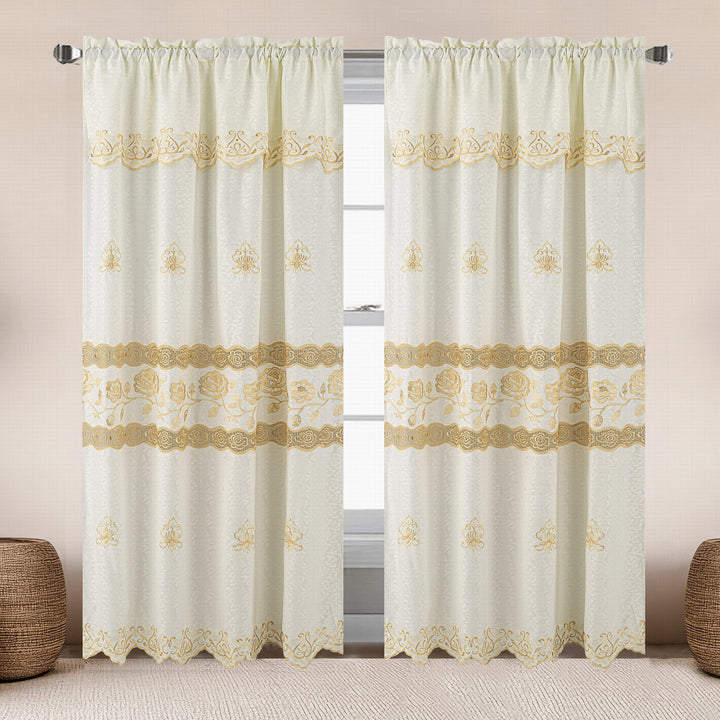 Add refined texture and timeless elegance to your home with the Sufeena Macramé Jacquard Window Curtain Panel with Attached Valance. Crafted in a rich jacquard fabric and finished with detailed macramé accents, this panel brings a beautifully layered, designer look to any room. The coordinating attached valance completes the window treatment effortlessly, offering a polished appearance without the need for additional pieces.