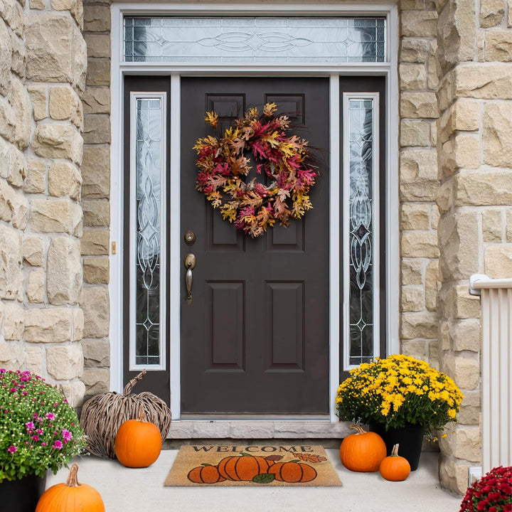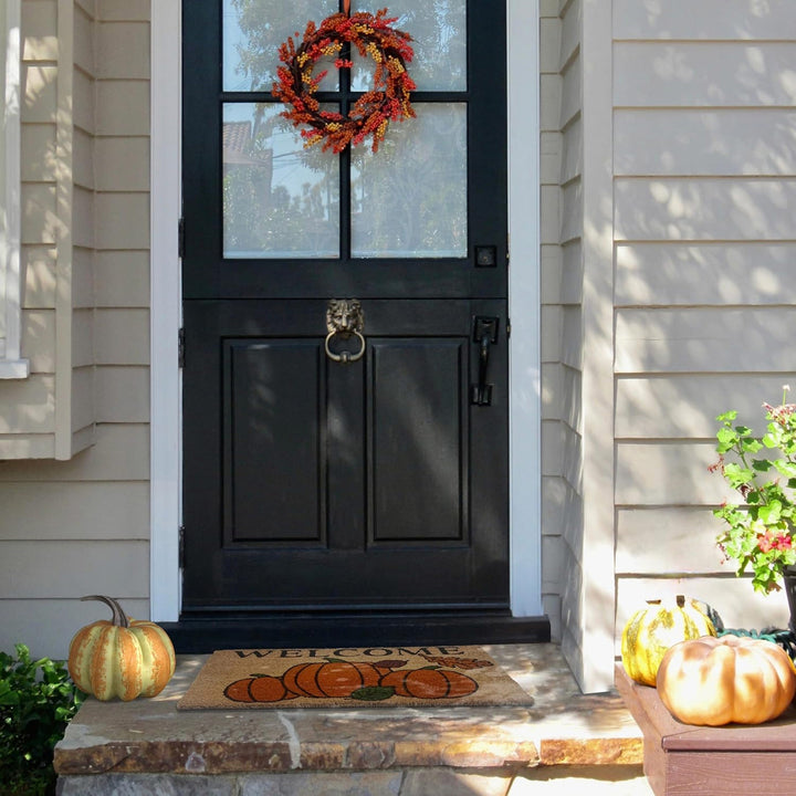 Welcome guests with the Achim Autumn Foliage Printed Non-Slip Coir Mat. This cozy 18x30 Inches mat features the word "WELCOME" alongside cheerful orange pumpkins, adding a festive touch to your home decor. Made from durable natural cocoa fibers, this mat is perfect for both indoor and outdoor use. Its non-slip design keeps it securely in place, while the fibrous material helps to trap dirt and debris before it gets inside. This fun and functional mat is a perfect accent for a housewarming or to celebrate holidays like Halloween and Thanksgiving.