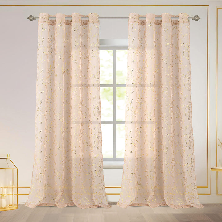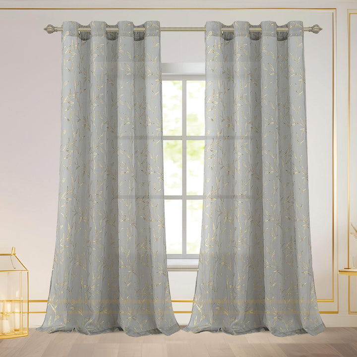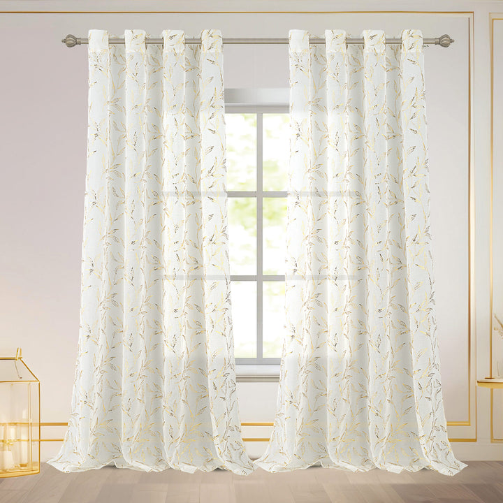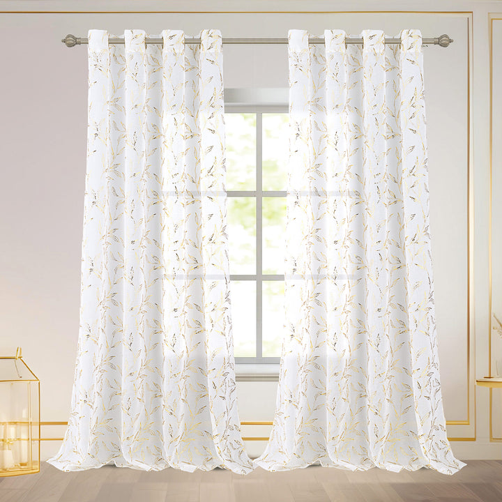 Bring shimmering elegance and soft light into your home with the Abira Metallic Leaf Foil Sheer Grommet Window Curtain Panel. This stylish 54x84 inch curtain features a dazzling metallic foil design that catches the light and adds a touch of glamour to your space. Made from durable polyester, the sheer fabric naturally softens incoming natural light, filling your living room or bedroom with a warm glow while providing daytime privacy. The grommet top ensures easy hanging and a sleek, modern drape.