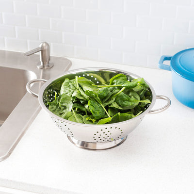 Conquer culinary challenges with the Home Basics Stainless Steel Colander and Strainer, a 5-quart kitchen essential that marries robust functionality with a polished aesthetic. This gleaming silver colander, forged from premium, heavy-gauge stainless steel, delivers unparalleled durability and a touch of modern elegance to any kitchen setup. Its expansive, deep-basin design effortlessly manages large volumes of pasta, hearty greens, or delicate fruits, ensuring swift and thorough draining and rinsing. Bid farewell to flimsy, inadequate strainers; this steadfast colander is engineered for daily use, transforming meal preparation into a seamless and efficient process. A kitchen workhorse that exudes timeless sophistication, it's the perfect companion for both everyday cooks and seasoned chefs.