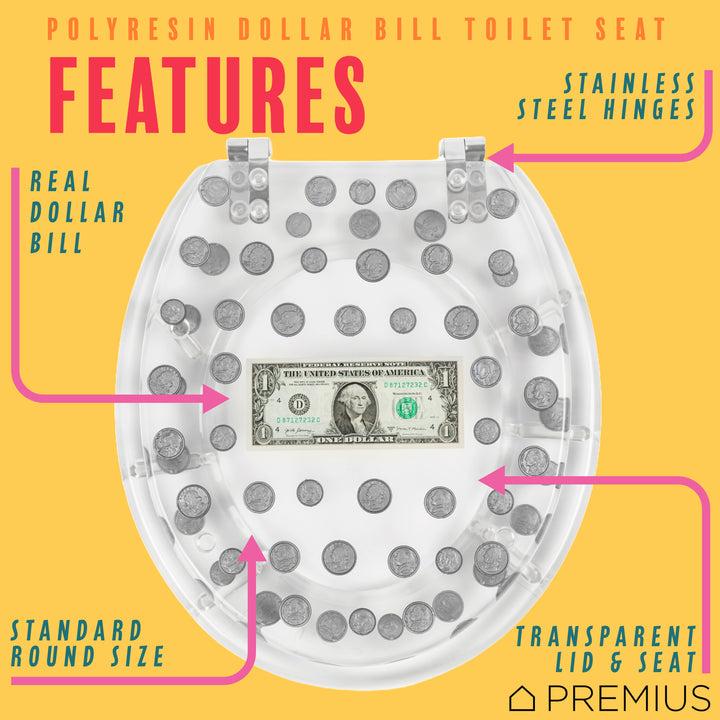 Turn your ordinary bathroom into an extraordinary space with the PREMIUS Polyresin Toilet Seat featuring a real dollar bill and plastic coins. This unique and eye-catching piece is more than just a toilet seat; it's a conversation starter that adds a touch of fun and unexpected style to your home. Smooth surface for comfort and quality. The Comfort rubber seat bumpers improve toilet seat stability and your bath experience.