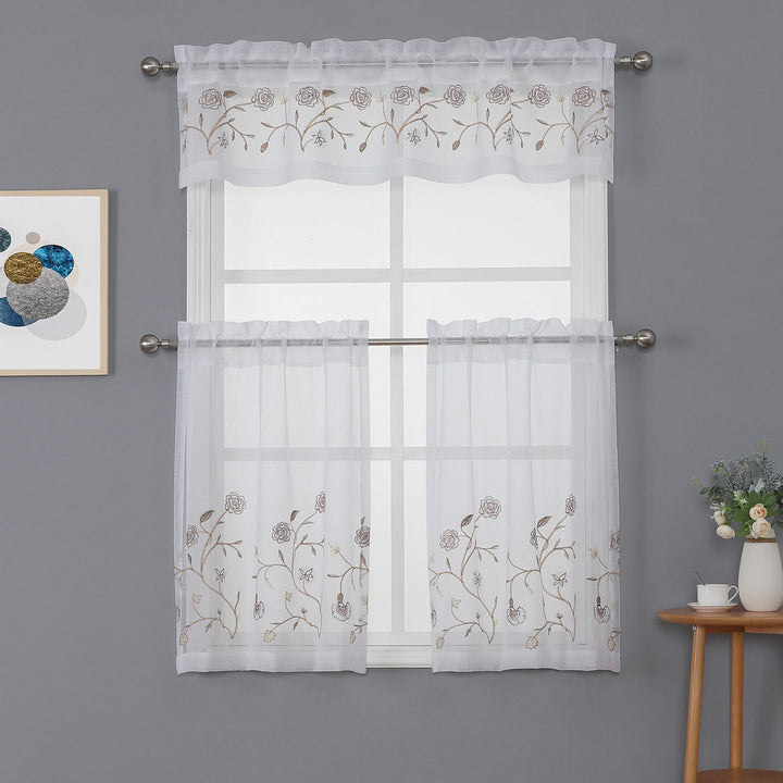 Instantly upgrade your kitchen or living space for a refreshing display using this Vivian 3-Piece Floral Embroidered Kitchen Curtain Set Straight Valance. The delicate floral embroidery on the smooth sheer fabric will hang beautifully on your windows. This curtain will invoke thoughts of happiness and new beginnings. It is sure to add a fresh floral look to your view. The curtain will filter the sunlight into a warm glow, while providing ample privacy. Add these curtains to your kitchen, laundry rooms or anywhere you would like to hang a beautiful curtain. Made of 100% polyester, that is strong and durable as they are resistant to wrinkles and shrinking. This 3-piece set includes a 60x36 inches valance and two 30x36 inches tiers. This window set comes with a rod pocket that makes it easy to install. And it’s machine washable for easy cleaning. CARE: Machine wash in a cold gentle cycle, using mild detergent. Do not use fabric softener. Do not use bleach. Tumble dry low. Iron on lowest setting if needed. MATERIAL: 100% Polyester. SIZE: Valance: 60x15 Inches. Tiers: (2) 28x36 Inches.