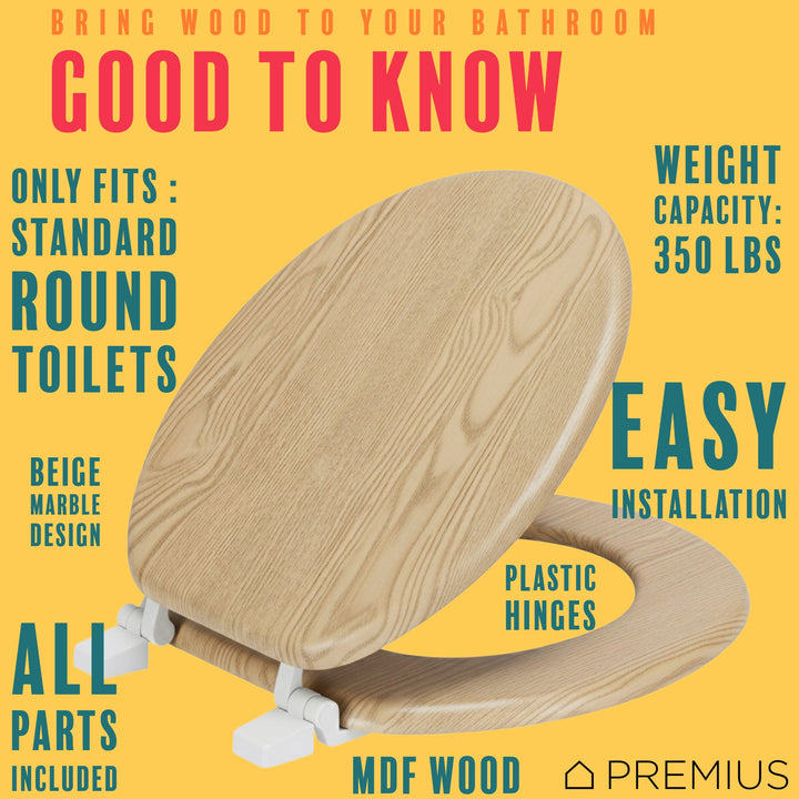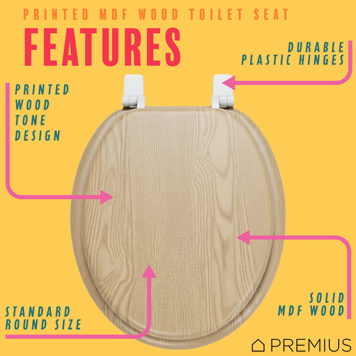 Give your bathroom a comfortable and stylish refresh with this Premium Printed MDF Wood Round Toilet Seat. This seat features a beautiful Printed Oak Wood Design, providing a warm, natural look to your space. Crafted from solid MDF wood, it offers a substantial and comfortable feel. This seat only fits standard round toilets with its 17-inch size and includes durable plastic hinges for a secure, long-lasting fit. It's a quick, easy update for a fresh new look.