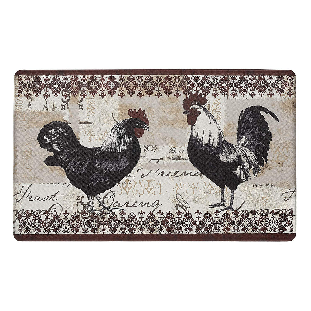 Standing for long periods of time can take a toll on your muscles and joints. This anti-fatigue mat is the best comfort mat you will ever own. This beautiful Rooster Decorative Anti-fatigue Mat by Achim features a vibrant and colorful design that is sure to add a nice touch to any space. Place this mat where you stand most and they will reduce and relieve the pressure on your knees, feet and joints. The cushiony foam will conform to the contours of your feet and reduce fatigue while you stand. Standing while you work has never been easier! The poly vinyl chloride (PVC) foam construction of this Anti Fatigue Mat makes it very strong and durable. Poly Vinyl Chloride is used mostly in building materials because of its resilience. Puncture, tear, mildew and stain resistant, this Anti Fatigue will provide you with superior comfort and last a very long time! This mat not only looks good, it’s super easy to clean too! Just wipe down with a moist washcloth and mild detergent. The non slip base of this mat will prevent falling. Increase productivity and decrease injury with these mats. Perfect for bedrooms, kitchens, laundry rooms, garages or even exercise rooms. COLOR: Brown. DIMENSIONS: 18x30 Inches.