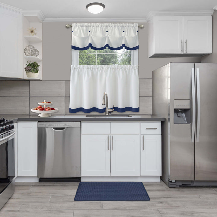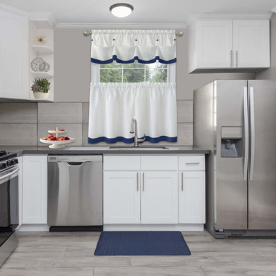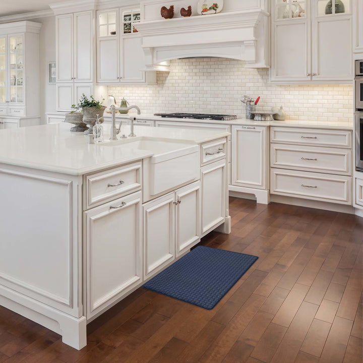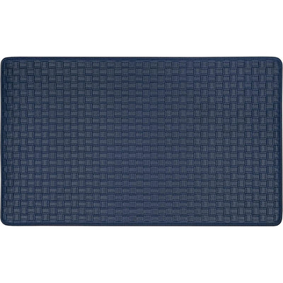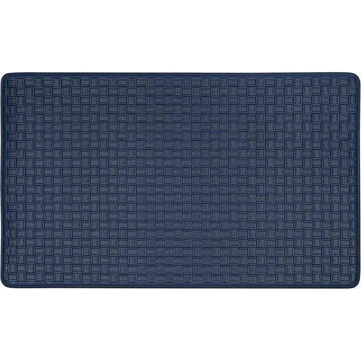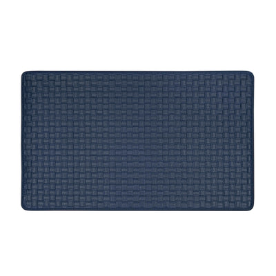 Ease your back and leg pain with this Achim Woven-Embossed Faux-Leather Anti-Fatigue Mat. This anti-fatigue mat provides support to help reduce fatigue when standing, while adding a decorative touch to your kitchen or bathroom. Features solid colored and embossed to resemble woven leather strips with baseball stitching. Made of durable and supportive Eco PVC foam. It gives support to your knees, ankles and back. Anti-fatigue mats are the perfect choice for any space. Perfect kitchen mat, provides relief for those standing for long amounts of time without compromising beauty in your home space. The mat is designed with a beveled edge and non-slip backing, helpful to protect you from slipping and tripping. Easy to clean and this mat can be utilized for a wide variety of uses. CARE: Clean with brush, broom, vacuum or shake briskly. MATERIAL: Eco PVC Foam. SIZE: 18x30 Inches. COLOR: Navy