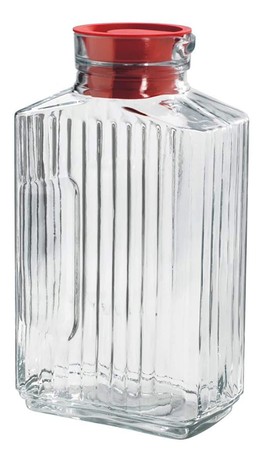 Beautifully serve mixed drinks, iced teas or sodas with this fun and functional bistro pitcher from Anchor Hocking. Made from sturdy glass, this pitcher features a cherry red stopper that offers a timeless design. The sides are ribbed vertically for an elegant touch that provides a sure grip. It is the perfect addition for any brunch table, picnics and more. Made in the USA. SIZE: 10x 5.75 x 3.4 Inches. COLOR: Clear Glass, Red Stopper.