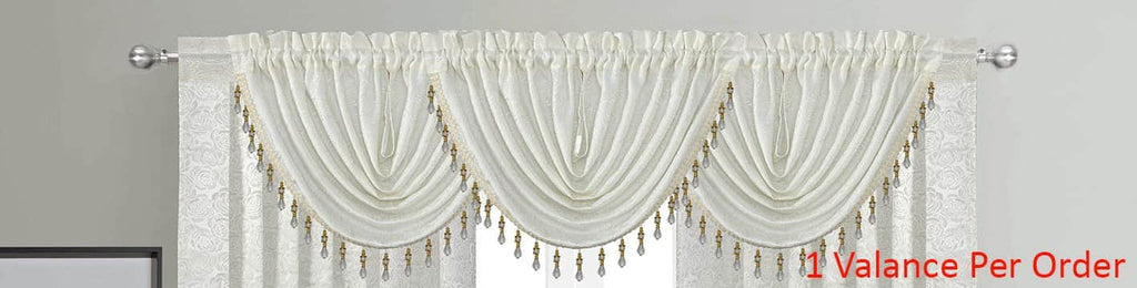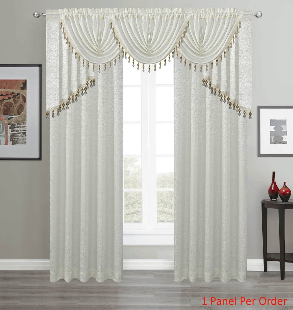 Transform any room in your home with this unique Angelina Rod Pocket Jacquard Window Panel, Valance and Swag. From traditional to contemporary living spaces, this gorgeous panel features a raised and patterned jacquard floral rose design that is woven directly into the fabric. A design that is trendy, stylish and perfect for complementing any decor! Get luxury quality without a lux price tag. These stunning curtains are durable, long lasting and totally washable. Provide you with ample light and privacy without compromise, the Angelina panel, valance and swags are beautiful and easy to coordinate, perfect for both our sweltering summers and chilly winters. Don't forget to pair with matching decorative swags and valances (sold separately) for a complete look! CONTENTS: Everything is sold in singles. Picture shows two panels, 3 valances, and 1 set of swags. The valances (sold separately), Swags come in Pairs. Mix and match colors and components to achieve a stunning design for your home and suit your taste. The stunning valances and swags have beautiful beaded tassels to accentuate the stylish new look. COLOR: White. DIMENSIONS: Panel 54X84 Inches (EACH), Valances 48x37 Inches (EACH), Swag Pair 2x12”x37” Inches. (EVERYTHING SOLD SEPARATELY).
