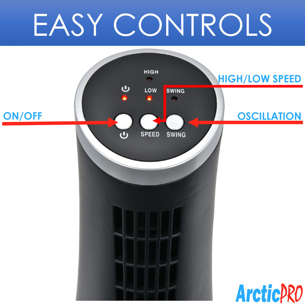 Cool down your office, bedroom or any room that needs a cool and quiet breeze with the Mini Desktop Oscillating Tower Fan By Arctic-Pro. It’s small and compact design is great for your desk space or by your bedside night table. Featuring a whisper quiet operation motor, you are able to complete your daily task without any distractions. This powerful oscillating fan provides versatile air circulation for personal comfort. Use the electric touch controls to adjust the speed and oscillation control. Set the fan from low to High or keep the fan stationary or oscillate, it's up to you. Turn the desktop fan on and choose your setting! It’s 75 degree wide oscillation will cool down and provide you with even air distribution. It is ideal for offices, classrooms, and bedrooms, kitchens, desks, kids’ rooms, cubicles, use this slim desktop tower fan anywhere. Featuring a convenient carrying handle this mini tower fan is perfect for traveling and transporting from one room to another. It’s unique look and amazing performance will keep you cool. DIMENSIONS: 5x12 Inches. COLOR: Black.