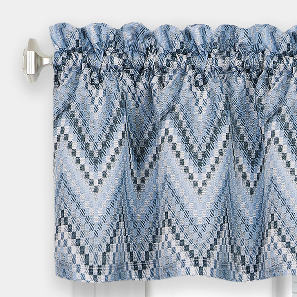 Stylishly update your kitchen windows with the Avery 3-Piece Tier and Valance Set. With a beautiful and vibrant chevron inspired design, this curtain set will add a chic touch to any kitchen, laundry room or any room where you would like to hang a beautiful curtain set. Made of 100% durable polyester, this curtain set is resistant to wrinkles and shrinking, breathable and machine washable. They will serve as your beautiful curtain set for the longest time! INCLUDES: One Valance (58x14 Inches) and One Tier Pair (58x36 Inches). COLOR: Blue. DIMENSIONS: Valance (58x14 Inches), Tier Pair (58x36 Inches).