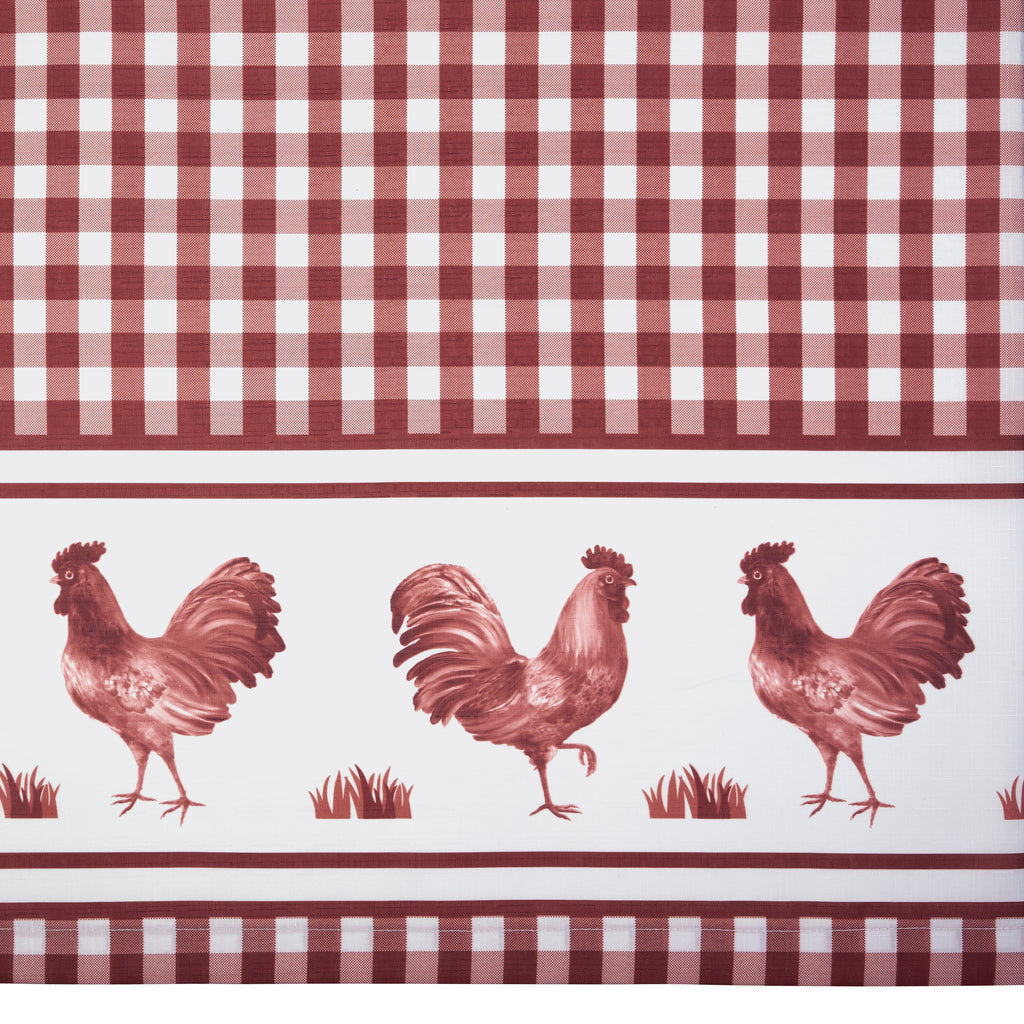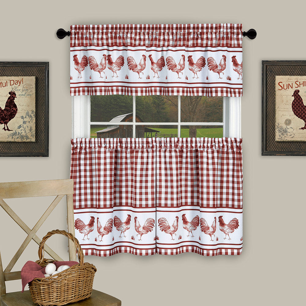 Redo your kitchen windows and add a classic design to your home decor with Barnyard’s 3 Piece Tier and Valence Set. This attractive window curtain set features a beautiful gingham pattern along with roosters. This 3 Piece Tier and Valence Set is functional and stylish. The fabric is thick enough to provide ample privacy and just the right amount of light to enter your home. This curtain set will make any room feel like home and add a country-side feel. Perfect for laundry rooms, kitchen windows and anywhere you would like to hang a beautiful curtain. CARE INSTRUCTIONS: machine wash in cold water, do not bleach, tumble dry on low and light iron as needed. COLOR: Burgundy. DIMENSIONS: (Valence: 58x14 Inches), (Tier Pair: 58x36 Inches).