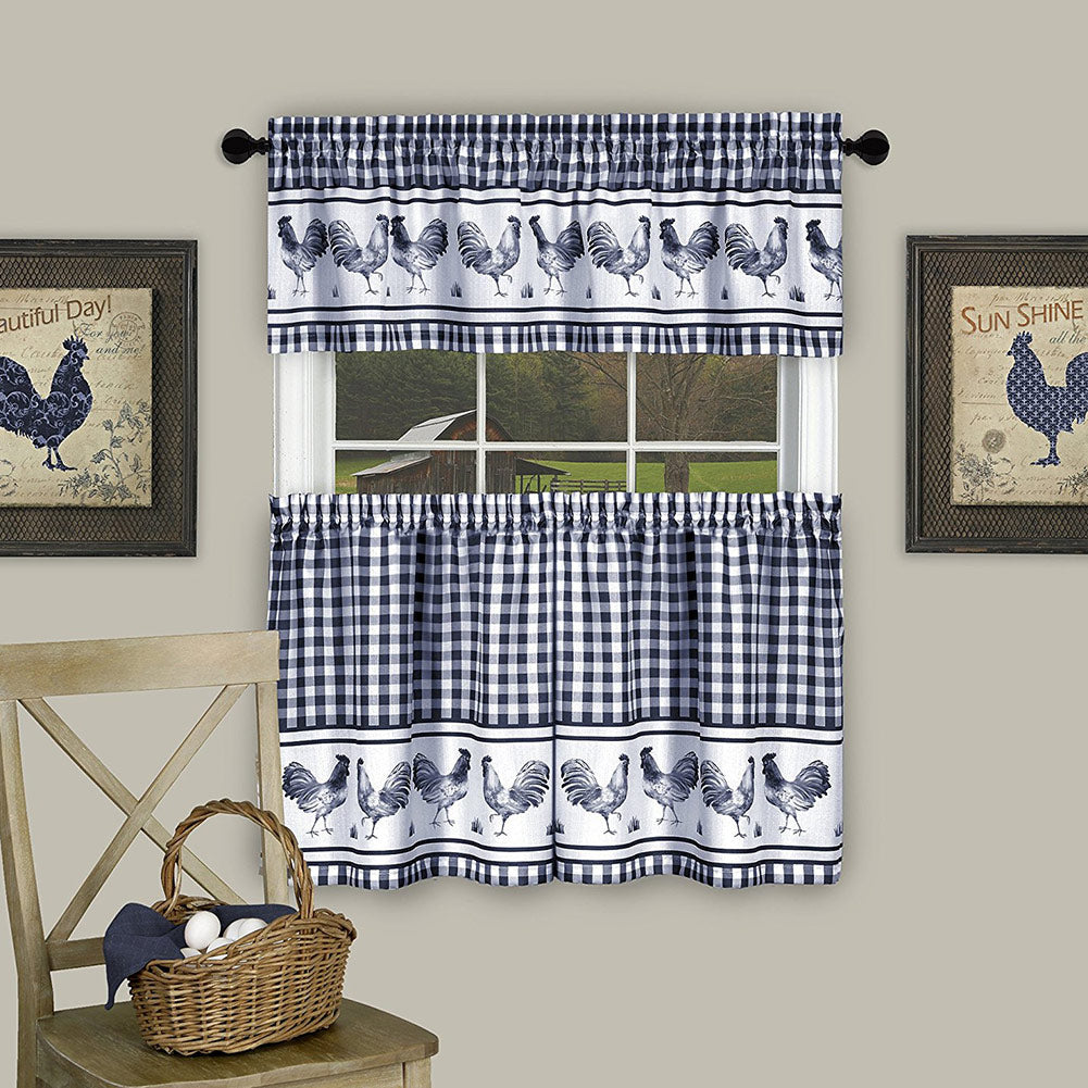 Redo your kitchen windows and add a classic design to your home decor with Barnyard’s 3 Piece Tier and Valance Set. This attractive window curtain set features a beautiful gingham pattern along with roosters. This 3 Piece Tier and Valance Set is functional and stylish. The fabric is thick enough to provide ample privacy and just the right amount of light to enter your home. This curtain set will make any room feel like home and add a country-side feel. Perfect for laundry rooms, kitchen windows and anywhere you would like to hang a beautiful curtain. CARE INSTRUCTIONS: machine wash in cold water, do not bleach, tumble dry on low and light iron as needed. COLOR: Burgundy. DIMENSIONS: (Valance: 58x14 Inches), (Tier Pair: 58x36 Inches).
