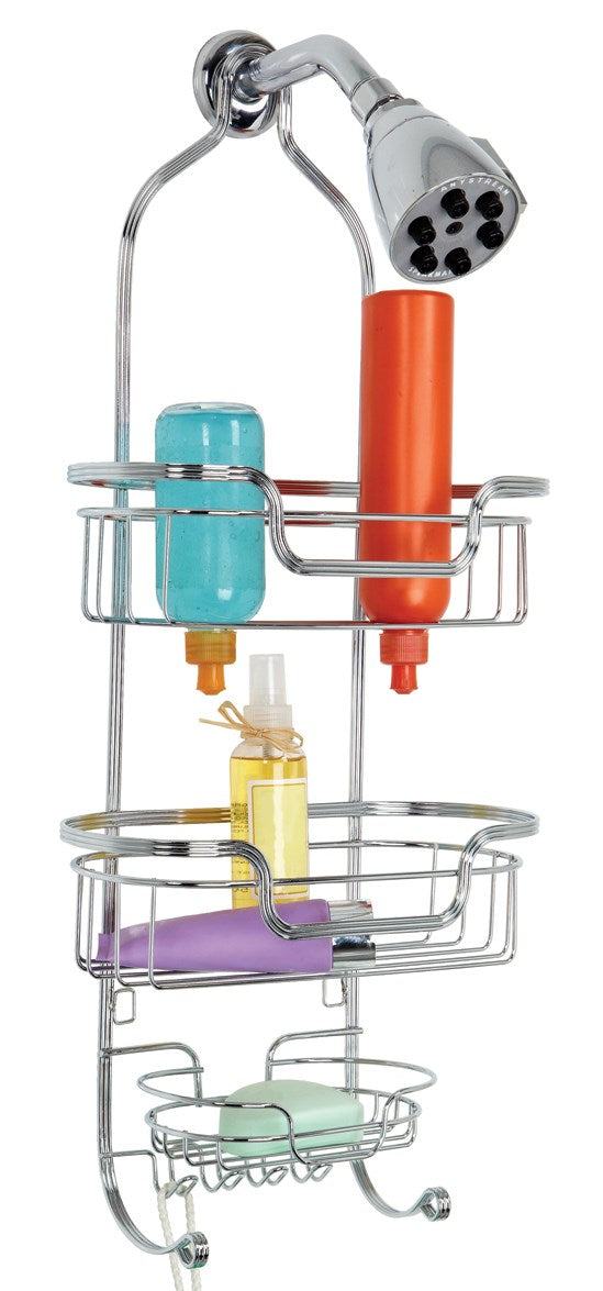 Bath Bliss 3-Tier triple wire design shower caddy organizer. It features bottle holder design, separate soap. Made of stainless steel construction. It hangs over a fixed shower head. Size: 11.25 " x 26" x 5" (28.6 cm x 66 cm x 12.7 cm). Color: Chrome finish.