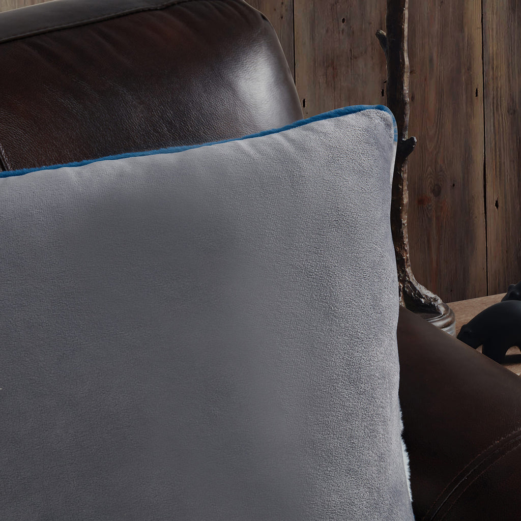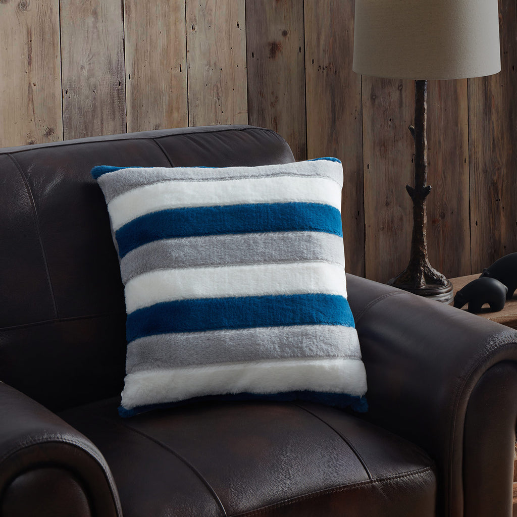 Add irresistibly soft texture to your bed, couch, or favorite chair with the Bearpaw Pieced Faux Fur Stripe Decorative Pillow. This 20" x 20" accent pillow has striped rabbit fur on one side and solid mink on the other for two sides of cozy comfort. Colors: Navy, Grey, White.