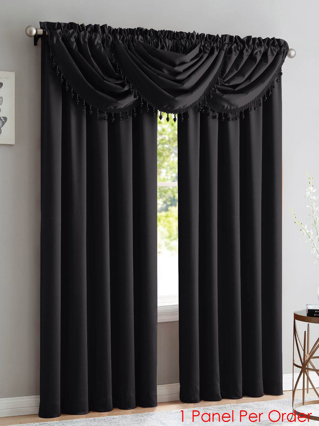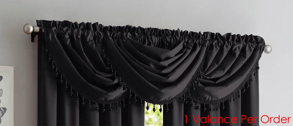 Transform the look of any room with this attractive Bridget Crushed Satin Window Treatments with Waterfall Valance and a Decorative Fringe. It adds a fresh and elegant touch to any window in your home. Made of 100% premium polyester fabric that makes this panel look great in any setting. With a crushed satin look and feel, the panel and valances fuse a vibrant solid color design that has a soft shimmer. Sure, to add a touch of elegance and update your home’s decor! The panel measures: 52 Wide by 84 inches Length, and the valance measures: 48 Wide by 37 Inches Length. Create elegance in your home with this Bridget Crushed satin panels and valances With Decorative Fringe. CLEANING: Very easy to clean. Just machine wash on a cold, gentle cycle. Remember not to use bleach! INCLUDES: All Bridget panels and valances are sold separately. Color: Black.