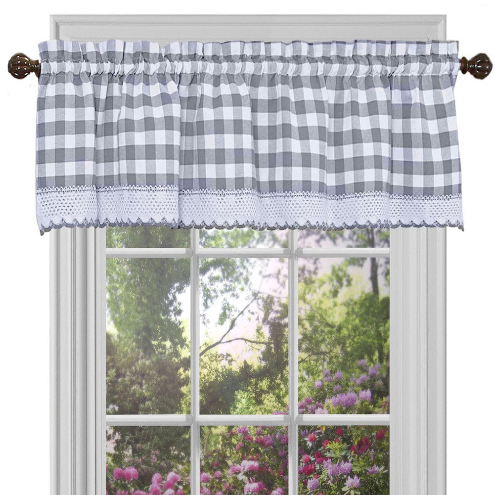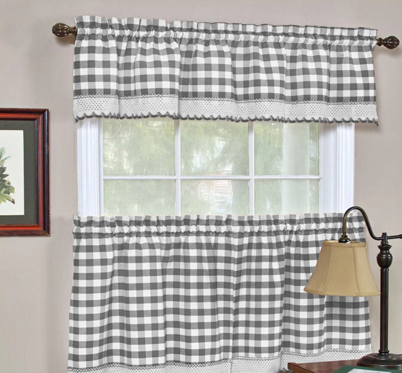 The Buffalo Check Gingham Kitchen Curtain is a classic, high quality linen furnishing. This decorative window treatment is styled in a timeless country design. The valance and tiers are trimmed with an embossed lace detail that will enhance the look of any room. Simple yet elegant and fabricated with the finest cotton and polyester fibers. The premium poly-cotton blend feels wonderful, thick but light, the right combination to accommodate any setting. Achim's Buffalo Check fits on most standard or decorative rods and is durable. Overall it is truly a beautiful, classic piece that will withstand the test of time. Care Instructions: Machine wash cold, delicate cycle, mild detergent, tumble dry low. Do not bleach and warm iron if needed. Materials: 60% Polyester and 40% Cotton. Valance Size: 58x14 Inches. Tier Size: 58x36 Inches. (Fits windows up to 36 Inches wide.) Package Color: Grey. Product Colors: Grey and White.