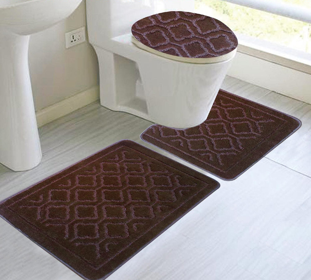 Catherine 3-piece mega size bathroom mat set with quatrefoil designs. Add durable style and safety to your bathroom with the Catherine 3-piece mat set. Made of 100% Polypropylene and featuring a non-skid latex backing for safety. Care instructions: Do not dry clean. Wash separately. Do not bleach. Line dry only without delay. Keep it away from the sun light. Shake regularly to lift pile. Gentle machine or hand. Catherine 3-piece mat set comes with one bath mat 24" x 40", One contour 24" x 20" and one lid cover 19" x 20". Color: Coffee Brown.