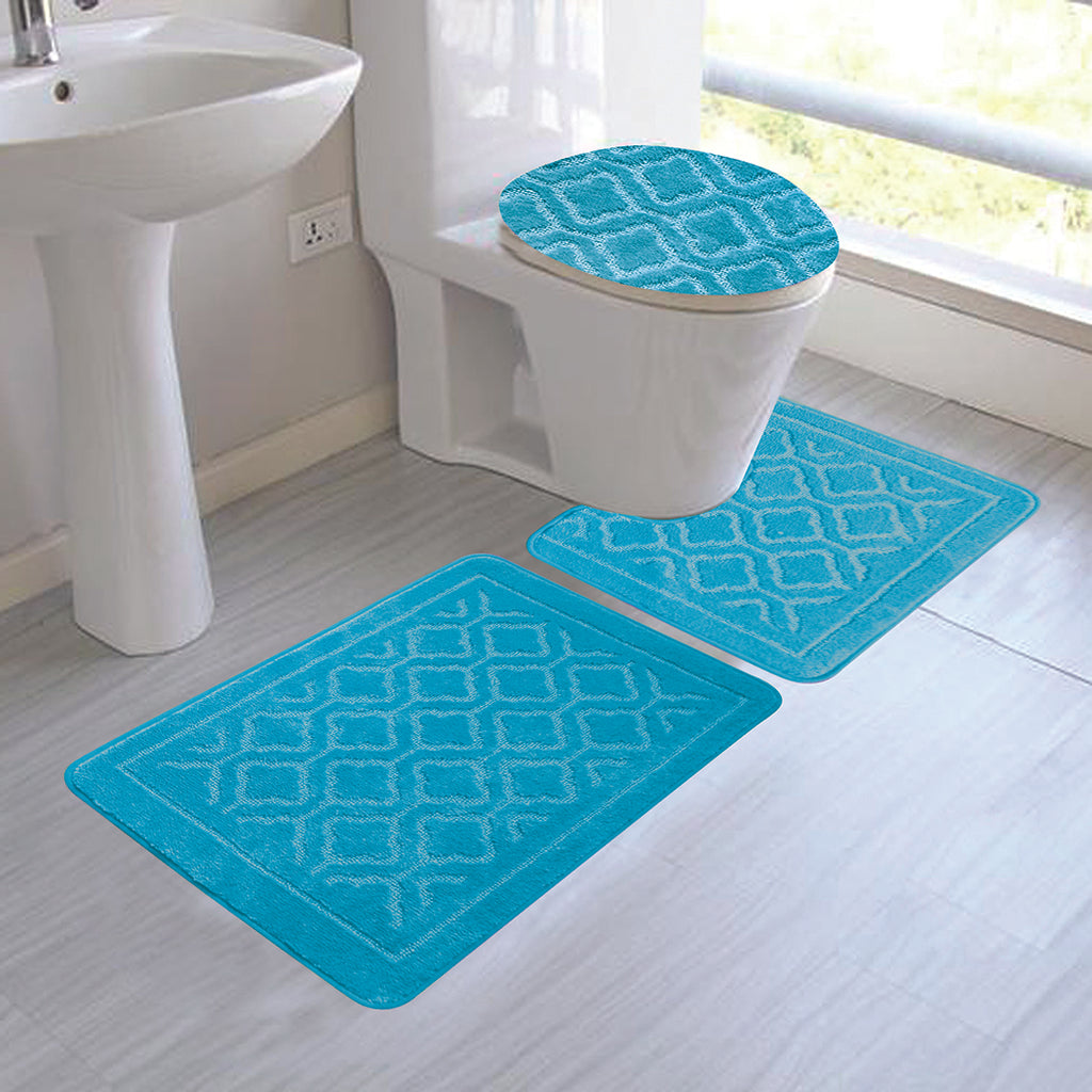 Catherine 3-piece mega size bathroom mat set with quatrefoil designs. Add durable style and safety to your bathroom with the Catherine 3-piece mat set. Made of 100% Polypropylene and featuring a non-skid latex backing for safety. Care instructions: Do not dry clean. Wash separately. Do not bleach. Line dry only without delay. Keep it away from the sun light. Shake regularly to lift pile. Gentle machine or hand. Catherine 3-piece mat set comes with one bath mat 24x 40 inches, One contour 24x20 inches and one lid cover 19x 20 inches. Color: Teal.