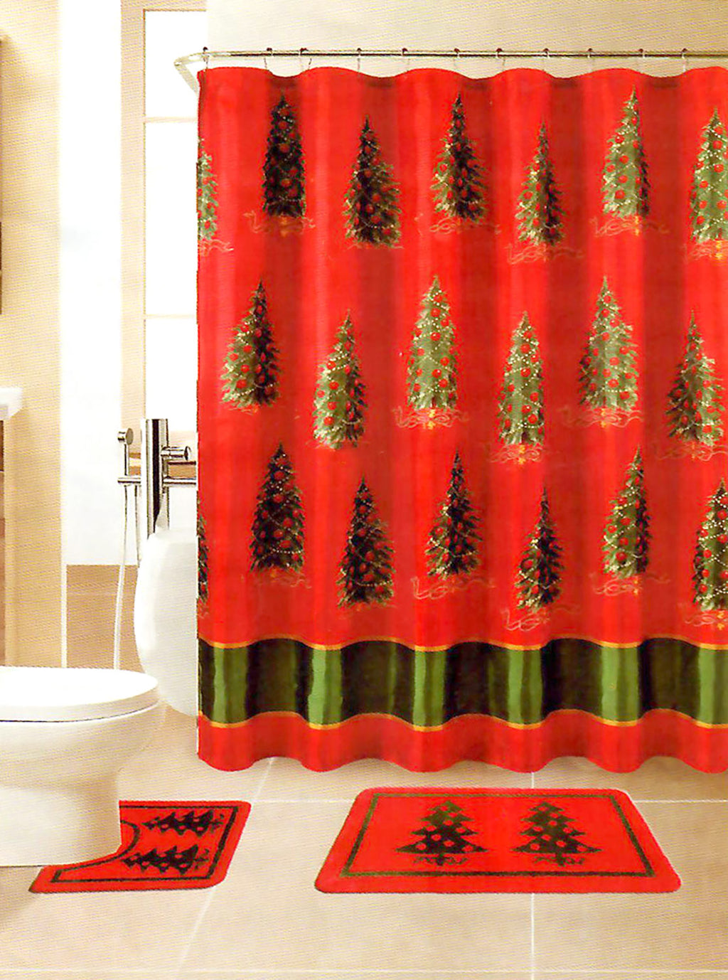 Add a touch of delight to your holiday home decor with this Christmas Tree 15-Pieces Bath Rug Mat Set. This decorative bath set features beautiful printed christmas trees all over the shower curtain and the rugs. The color and picture of this decorative christmas tree rug bath set will brighten up and add Christmas spirit to your bathroom decor. A perfect way to upgrade your bathroom decor for this holiday season. Celebrate the most wonderful and joyful time of the year. Makeover your bathroom with just a single touch while it contains a shower curtain and the matching bath rugs for a quick and easy way to refresh and completely change the appearance of your bathroom. This elegant Christmas tree bath rug set will spice up your home and add glamour and ambience and it will surely add an amazing touch to your holiday home decor creating a warm and inviting space for your special celebration. INCLUDES: (one) 70x70 Inches Shower curtain, with (12) hooks, (one) 18x30 Inches Bath mat, and (one) 18x18 Inches Contour mat. CARE: Machine wash in cold water. Do not bleach. Do not tumble dry. Do not dry clean. MATERIAL: 100% Polypropylene. SIZE: Shower Curtain: 70x70 Inches. Bath Mat: 18x30 Inches. Contour: 18x18 Inches. COLOR: Red-Green.