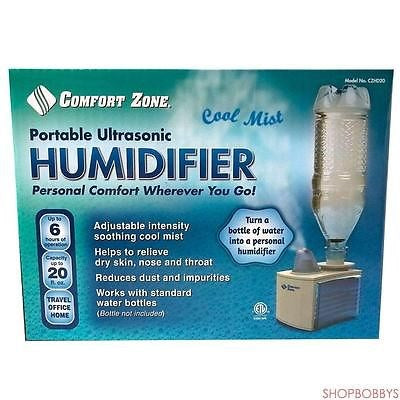 Comfort Zone portable ultrasonic humidifier uses ultrasonic technology to add soothing moisture to dry air. It offers personal, portable comfort with adjustable intensity. It helps to relieve dry skin, nose, and throat. It reduces dust and impurities. Perfect for home or travel. Whisper quiet operation.Works with a standard water bottle. (Bottle not included) It last up to 6 hours of operation and capacity up to 20 ounces. It has auto shut-off when water tank is empty.