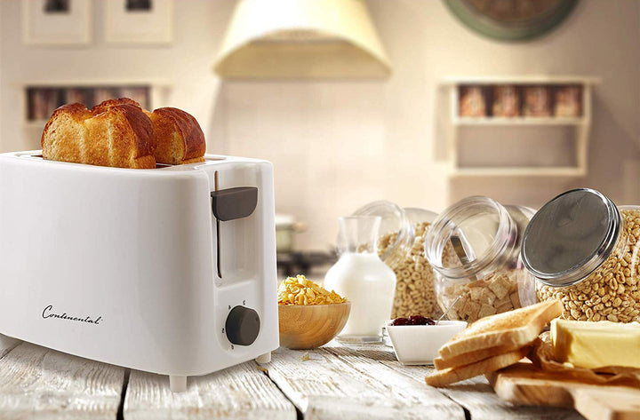The slice is right! The Continental 2-Slice Cool Touch Toaster is perfect for all of your toasting needs. Think your toaster is just for bread? You’re wrong. Perfect for bread, bagels, waffles and even toaster strudels, this toaster is the perfect helper when it comes to breakfast. The extra wide slots will handle the fluffiest bagel or thickest slice of bread, and will even allow you to achieve crispy brown veggie burgers, sweet potatoes, leftover pizza or even crispy bacon! This easy to use cool touch toaster features adjustable browning and a cancel function button that lets you control the right amount of browning for everyone’s taste. The easy to clean crumb tray means that cleanup time will be faster and easier. No more hassling with bulky toasters. Perfect for apartments, college dorm rooms, office kitchens, or any home. COLOR: White. DIMENSIONS: 6x9x5.5 Inches.