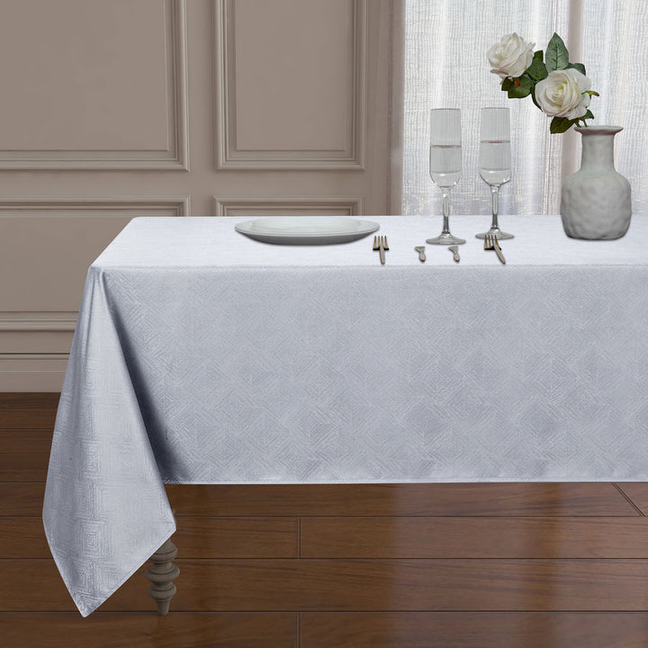 As you sit around the table whether for a merry feast, a quiet dinner, or a party, decorate your dining table with this Diamond Jacquard Spill Proof Tablecloth, to create an inviting ambience in your dining room. Featuring a subtle, yet elegant diamond jacquard design in vibrant solid color, this spill proof tablecloth will add a beautiful textured look to your tablescape while elevating your table decor. Crafted from 100% rich polyester, the Diamond Jacquard Spill Proof Tablecloth is strong and durable for long-lasting use and will protect your tabletop all year round. Polyester is resistant to wrinkles and shrinking. Prevent spills and protect your table while serving style! DIMENSIONS: 56x84 Inches(Seats 4-6). 70 Inches Round, (Seats 4-6), 56x104 Inches (Seats 8-10). CONTENTS: 1 tablecloth per package. PICTURE SHOWS 1 Tablecloth, PACKAGE CONTAINS 1.