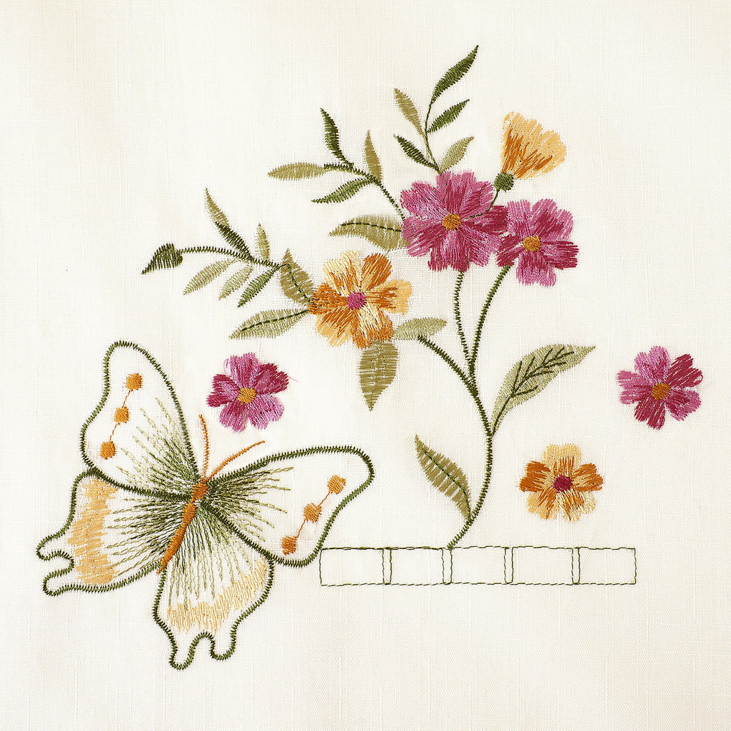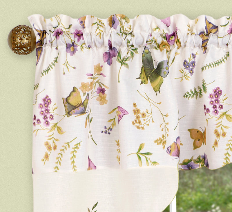 Bring the blooming garden of the refreshing spring season to your kitchen with the Enchanted Embellished Tier And Swag Kitchen Curtain Set. this gorgeous window ensemble features a vibrant and whimsical butterfly print with floral inspirations that will enhance any bathroom, laundry room, kitchen or anywhere you would like to hang a beautiful kitchen curtain. The fabric has the perfect thickness that will allow just the right amount of natural light and heat to enter your home while maintaining privacy. Made of 100% polyester, this kitchen curtain set will grace your home with charm and elegance for a long time. It is resistant to wrinkles, shrinking, mold and mildew. The fabric is breathable and machine washable - a great time saver! Being a rod pocket panel, installation of this kitchen curtain set is easy. Simply slide any curtain rod through and enjoy the look of your brand new kitchen. CONTENTS: Package contains (One 58x36 Inch Swag) and (One Pair of 58x36 Inch Tiers). COLOR: Purple.