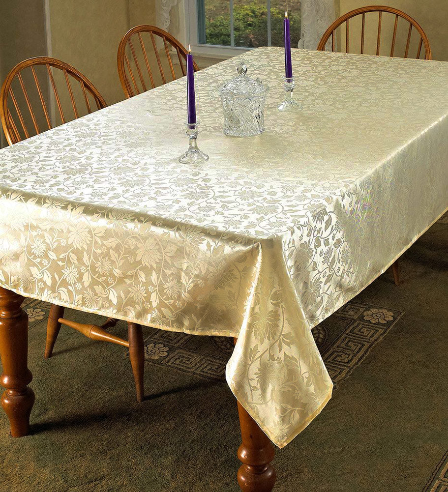 European Floral Design tablecloth dresses up your dinner, or any meal.It will transform your regular dining table to something that provides an elegant dining experience. The floral design on this is what makes it so appealing. The flower on the tablecloth resembles a lotus. The large flowers with sleek petals are linked to each other by a leaf pattern. It has a hemmed edge. Material: 100% Polyester. Machine washable. Color: Ivory.