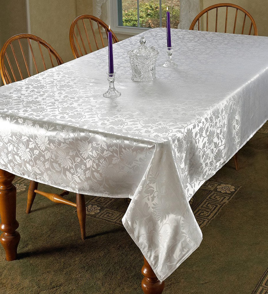 European Floral Design tablecloth dresses up your dinner, or any meal. It will transform your regular dining table to something that provides an elegant dining experience. The floral design on this is what makes it so appealing. The flower on the tablecloth resembles a lotus. The large flowers with sleek petals are linked to each other by a leaf pattern. It has a hemmed edge. Material: 100% Polyester. Machine washable. Color: White