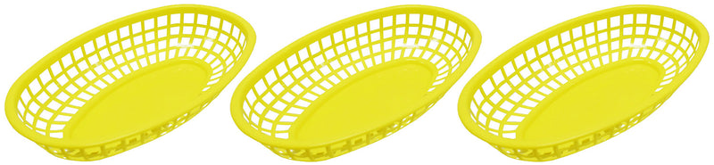 Serve up fried foods, wings, sandwiches, entrees, appetizers, and more in this 9.25” x 5.67" x 1.75” Yellow plastic oval food basket! Perfect for any casual dining establishment, these food baskets are a unique alternative to traditional plates. From sports bars and family-style restaurants to pool cabanas and other outdoor dining, these baskets complement any inviting and fun atmosphere. A vibrant Yellow color adds a pop of style and excitement. Made of plastic, sagging and spilling will be eliminated! Each basket is durably built to last through multiple food services and saves you in costs since they're reusable. Perfect for hot dogs, burgers, French fries, ribs, seafood, chicken, and more! Use these baskets with deli sandwich wrap paper for an enhanced food presentation! COLOR: Yellow. SIZE: 9.25” x 5.67" x 1.75” Inches.