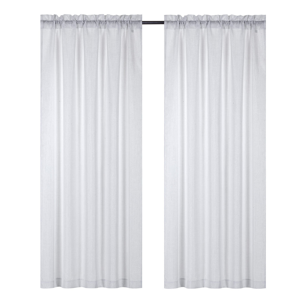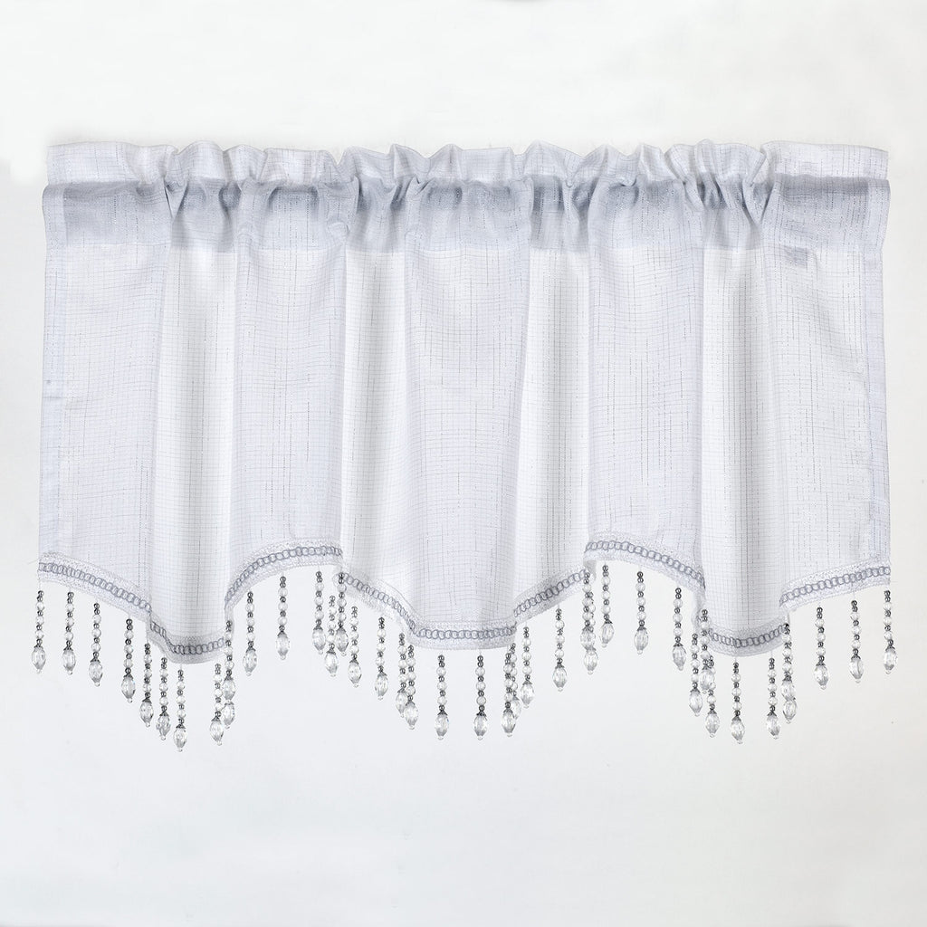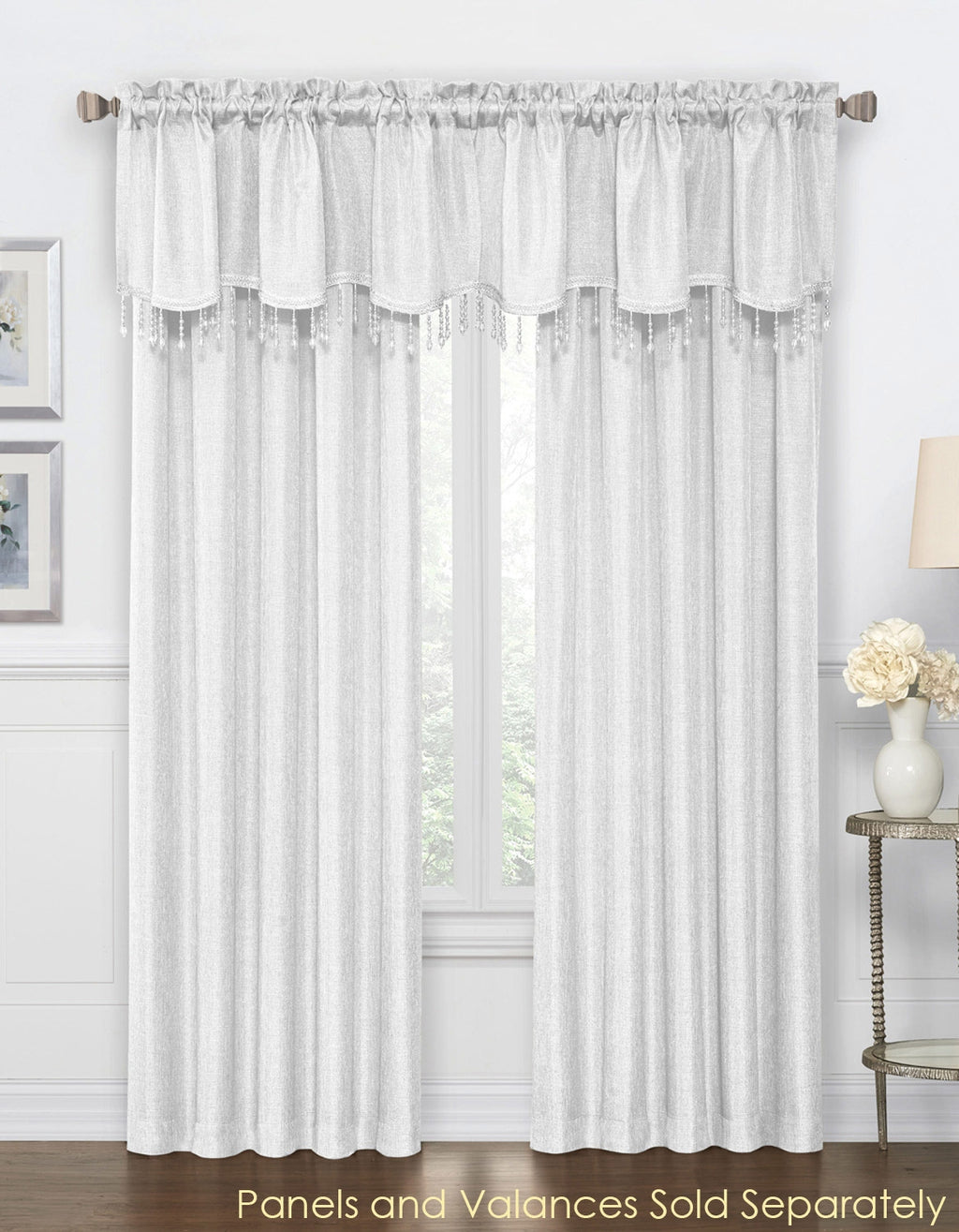 The seasons are always changing, which means it’s time to spruce up your living space. Our new Gina Panels and Scalloped Valances are the perfect decorative duo. Their faux canvas fabric has metallic threads running through it, giving them a shimmery finish, and the valance’s trim is lined with a detailed embroidery. Followed by the embroidery, is its beautifully beaded tassels hanging from its subtly scalloped rim. All these specific features come together to create such a beautiful decorative accent for any window or room in your home. Whether it’s your bedroom or your dining room, these panels and valances are bound to give it an elegant feel. Hanging is super easy, slide the rod through the rod pocket which can accomodate rods 1.5 inches in diameter. Panel and valance are sold separately. To achieve the look in this picture, 2 panels and 2 valances must be purchased. CARE INSTRUCTIONS: Machine wash cold. Gentle Cycle. Use only non-chlorine bleach when needed. Tumble dry low. Iron on lowest setting if needed. PANEL MEASUREMENTS: 52 in. W x 84 in. L (132 cm x 213 cm). VALANCE: 52 in. W x 20 in. L (132 cm x 51 cm) COLOR: White.