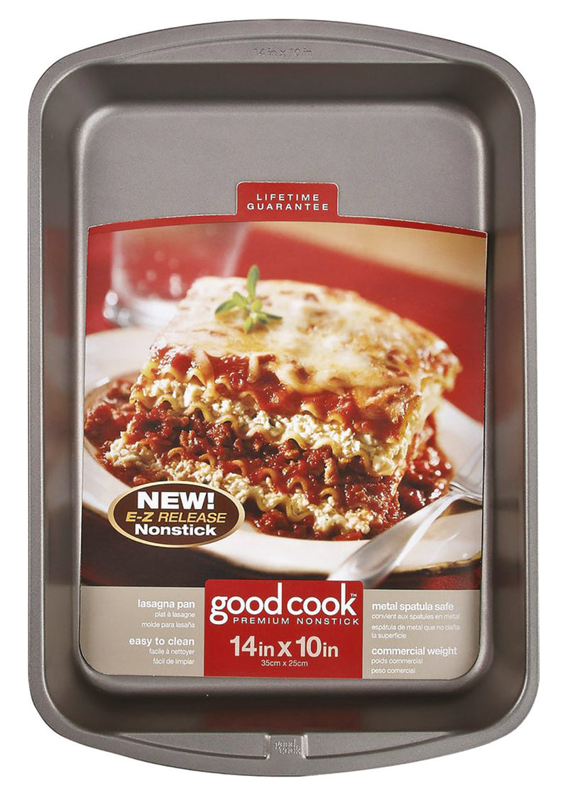 Perfectly cooked lasagna every time, with the Good Cook Baking pan! Great for baking lasagna, however the size also allows for baking anything from cinnamon rolls and cakes to roasting vegetables and meat. The Non-stick coating helps to resist scratching, allows for food removal and easy cleaning. Designed to distribute heat evenly for thorough baking. Made from heavy-duty gauge steel for longevity and prevents warping. Metal spatula safe. Commercial weight. Dishwasher safe. Easy-Release non-stick coating. SIZE: 11X14 Inches.