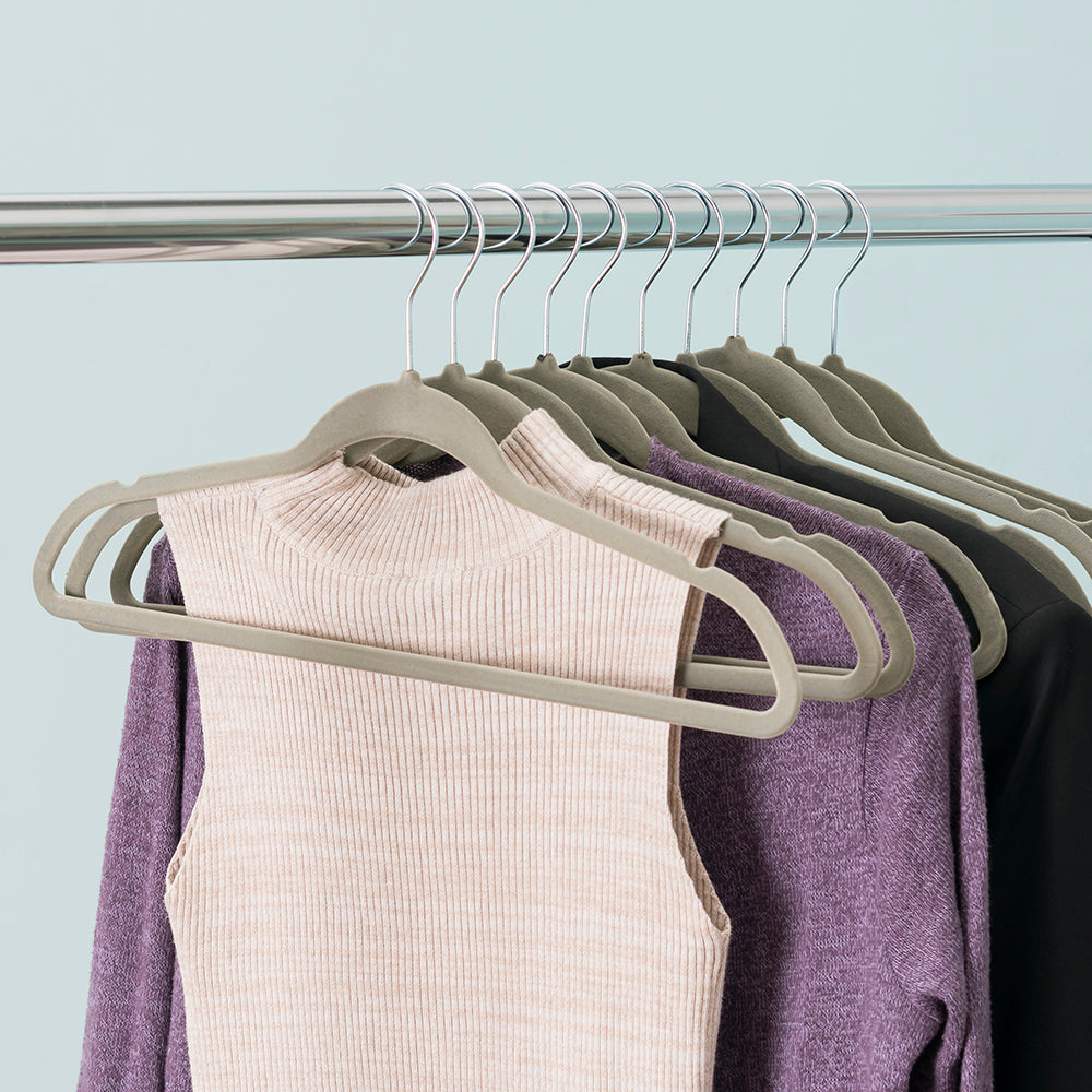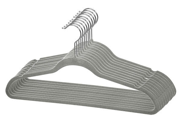 Make room for more clothes with the Home Basics 10-Pack Non-Slip Velvet Hangers. Boasting a slim profile not only do these hangers maximize storage space in your closet and look great, but the non-slip velvet material will ensure that your clothes stay in place. Designed with notched shoulders, these velvet hangers are great for hanging belts, ties, shawls, thin strap shirts, tanks and women undergarments such as nightgowns, bras, and camisoles. The Home Basics 10-Pack Non-Slip Velvet Hangers are durable and feature a sturdy design that enables a large capacity hold. Stronger and much lighter than wooden hangers but much sturdier to hold clothes without getting bent. Add these deluxe hangers to your closet storage. DIMENSIONS: 17.8x5x9.5 Inches. COLOR: Gray.