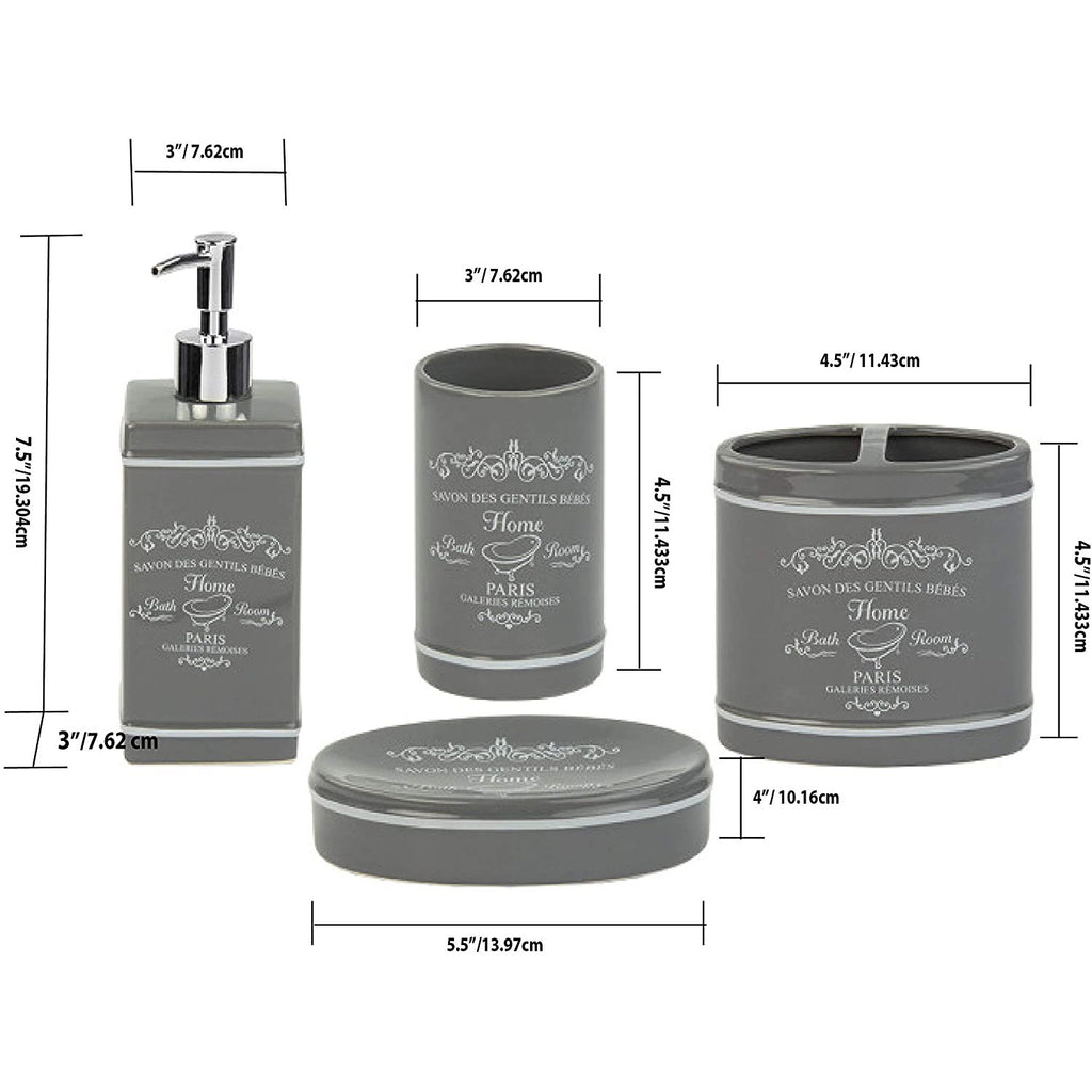 Grace your bathroom vanities with this Home Basics 4 Piece Ceramic Paris Bath Accessory Set. The set features elegant script with spiral detailing atop a delicate, white hue. Beveled black accents encompass each piece for added interest. The set comes complete with a soap dispenser, toothbrush holder, mug, and a soap dish. This Paris Bathroom accessory set will fill all your bathroom counter top needs allowing your sink area to stay clean and stylish! COLOR: Grey