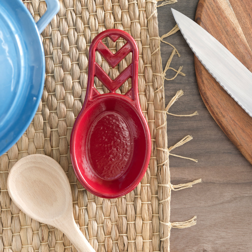 When you don't want to mess up your squeaky-clean counters with your Sauce-filled spoons, enlist the help of this refined cast iron Spoon Rest to keep them protected in a regal fashion from Home Basics. You'll enjoy the chic design as much as its functionality. Adorned with the beloved classic chevron, it captures the essence of vintage French style, while its oversized design perfectly cradles everything from small tasting spoons to larger cooking utensils such as ladles or spatulas. It is crafted heavy duty cast iron with an embossed finish that is substantial in weight to prevent it from slipping off the counter. The sloped open handle makes it easy to store away on a rack when not in use. Whether you need a place to rest cooking spoons after stirring and mixing, it's sure to punctuate your kitchen with a fabulous French Flair. CARE: Hand wash only. MATERIAL: Cast Iron metal. SIZE: 7.5x3.5x1.3 Inches. COLOR: Red.