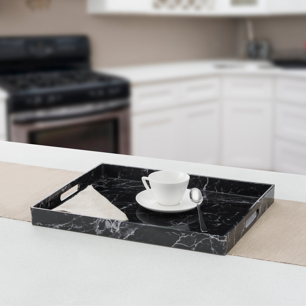 Set a stylish stage for your prized possessions with this chic vanity tray. Designed with striking veining, it gives off the look of authentic marble without the heft! Place it on your bathroom vanity as an exquisite showcase for perfumes, jewelry, or bath accessories. Take your décor up a notch by matching this piece with our marble bath accessories for a cohesive look. Or set it atop the countertop to corral loose change and mail. This versatile tray is perfect for any room in the house. Whether your bathroom lean towards contemporary or traditional this vanity tray will complement any bath with its vivid marble detailing, shape, and classic color. MATERIAL: Faux Marble. SIZE: 19x14x1.5 Inches. COLOR: Black