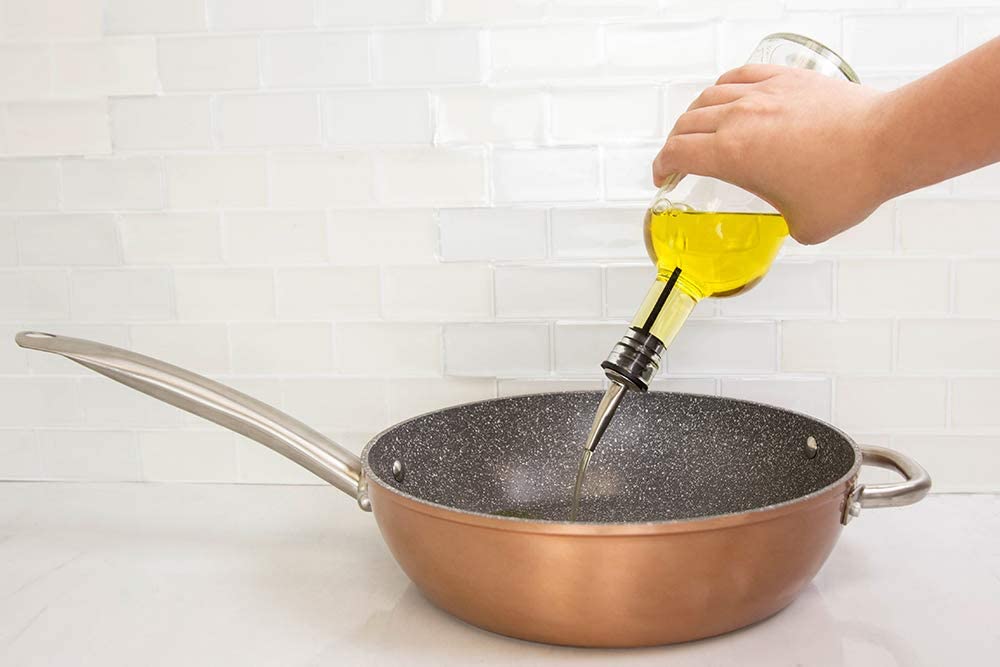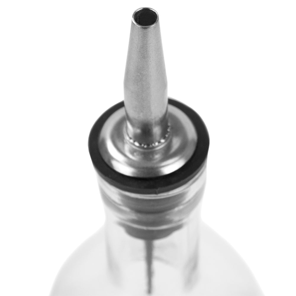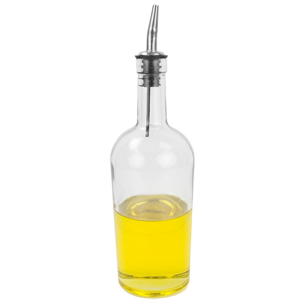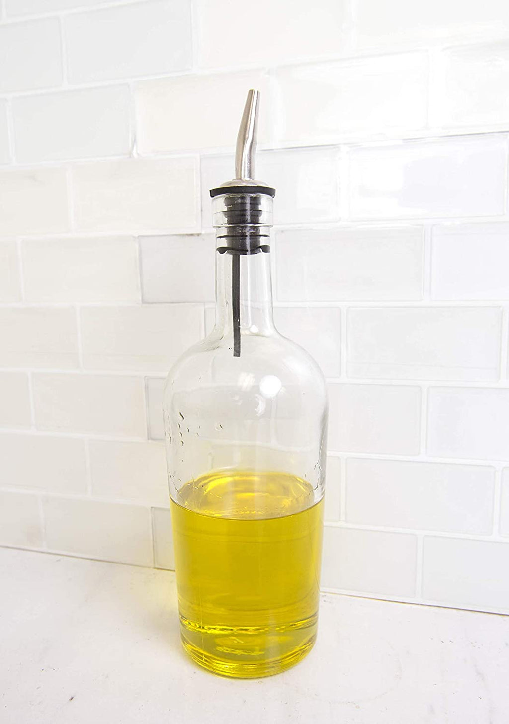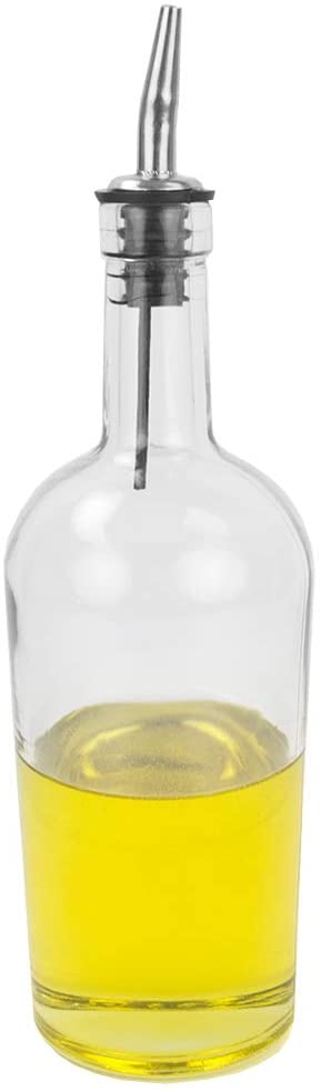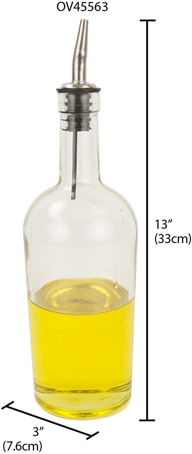 Store, serve and preserve your favorite olive oil or dressings in cutting edge style with the sleek Home Basics Round Olive Oil Bottle dispenser. Topped with a stainless-steel pourer, this clear glass bottle is a classic in modern kitchens. Keep it by the stove for cooking, or at the table for dressing salad greens or finishing food with a dash of olive oil. The silicone stopper and stainless-steel spout keeps light and air from affecting the flavor of the oil. The shape of this bottle takes up very little space on the counter, and the drip-free spout ensures a steady, even stream. With a capacity of 18.6 ounces, the bottle holds plain and flavored oils for cooking, baking, dressing salads and finishing dishes. Add this to your list of kitchen essentials and you won’t regret it. COLOR: Clear. CAPACITY: 18.6 Ounces.