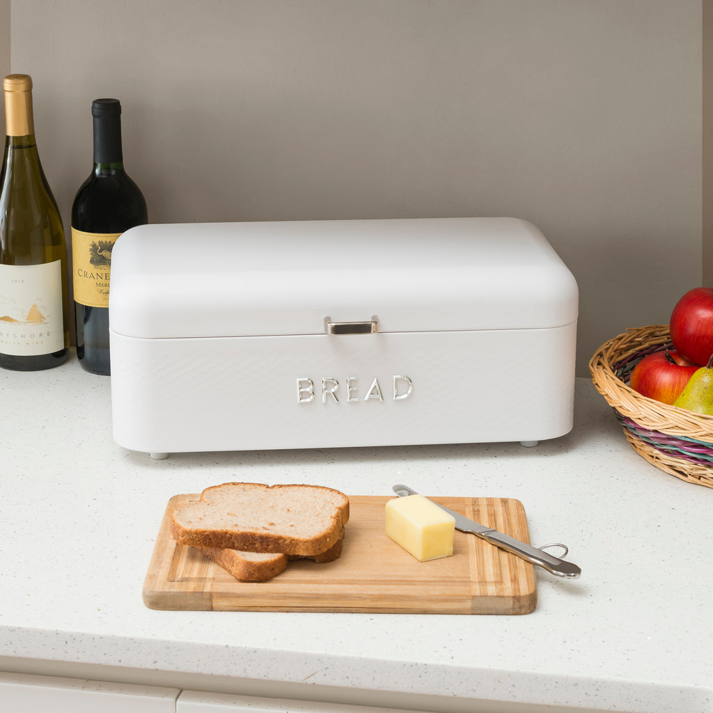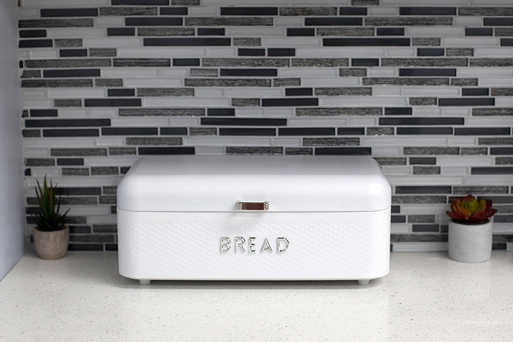 Keep your bread fresh and organized with this Home Basics Soho Bread Box. This modern and elegant bread box features a durable powder-coated steel, labeled with the word “BREAD” in silver. It is also equipped with a polished steel handle that allows you to easily open and close the box. You can stock it up with your freshly made artisanal bread to store bought rolls. This beautiful bread box offers plenty of room to store it all! From rich, moist cookies to soft herb infused bread, keep all your favorite baked confections neatly stored with this modern style bread box. The handle makes it easy for you to quickly open it to grab your favorite treat when needed and close the box to keep your snacks safe from inquisitive insects and prying eyes. This bread box is equipped with ventilation holes that allow air to flow through the lid to keep air away, while gathering up enough moisture to keep bread fresh. It is also labeled with the word “BREAD” to eliminate the guesswork of what is inside or lift up the lid to see what is inside the box, when it is dinner time, you all know where the bread will be stashed. Display this Home Basics Soho Bread Box on your countertop to wow your guests with your scrumptious baked goodies and snack for contemporary style. Easy to clean, no rigorous scrubbing required, simply wipe it down with a damp cloth or sponge to remove dust and debris. Care: Hand Wash only. Material: Steel. Size: 16.5x9x7. Color: Matte White.