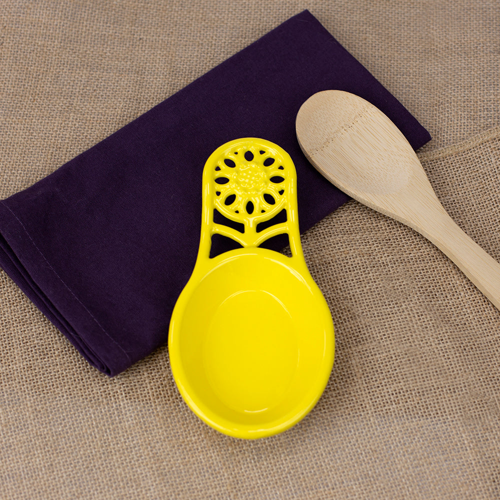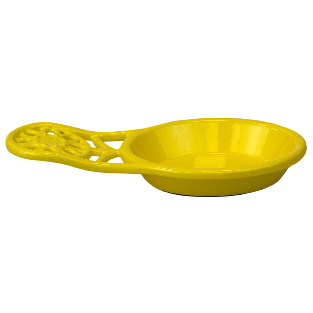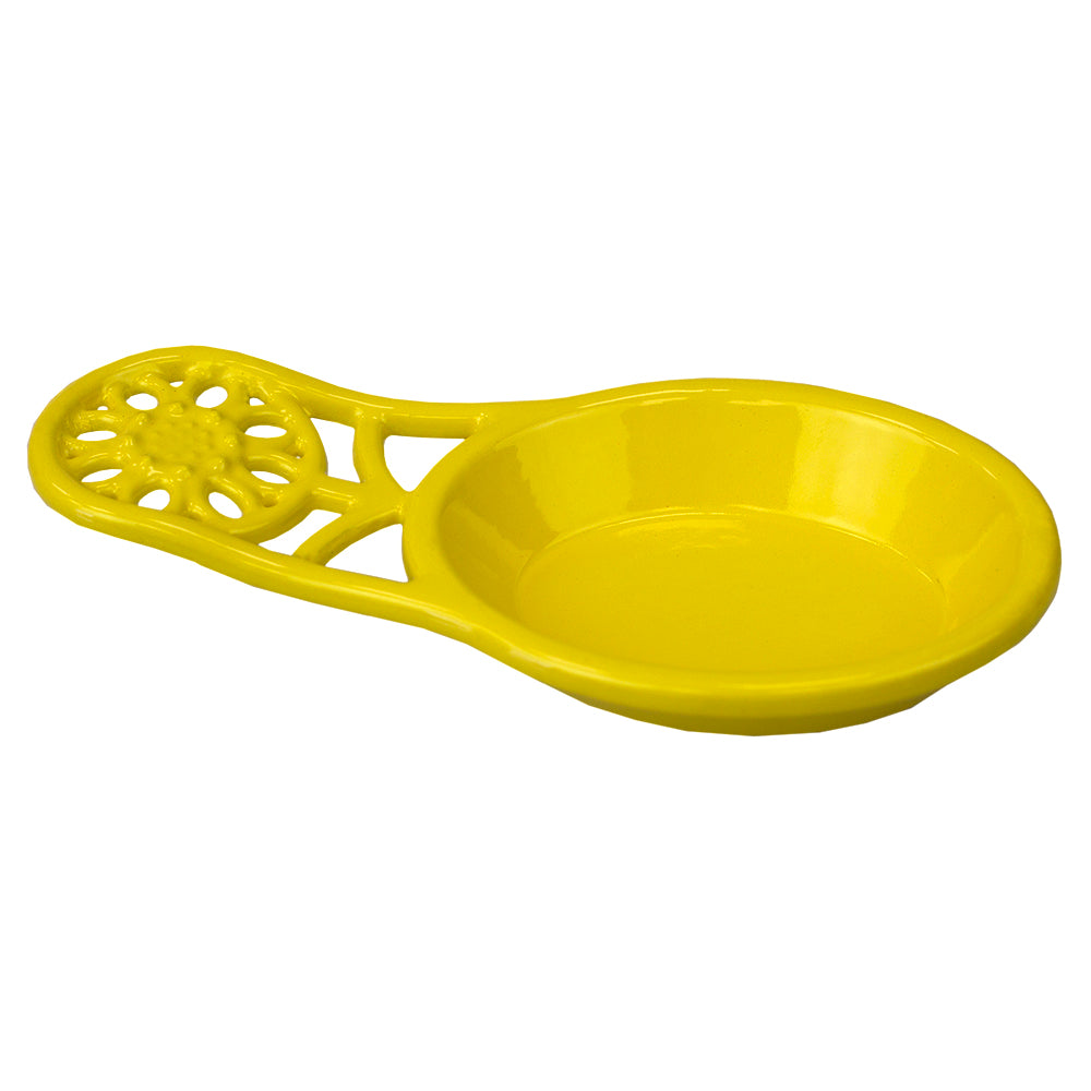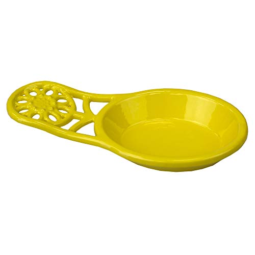 Add the Home Basics Sunflower Collection Cast Iron Spoon Rest to your sunflower collection. It’s the missing piece from your kitchen and the piece that’s here to stay. Built to last, cast iron is one of the best investments a cook can make! Whether it's a rustic granny's kitchen or a semi-pro chef with a six-burner gas range who loves entertaining friends this cast iron trivet will serve for every event. This cast-iron trivet is designed for the modern kitchen but also those hardworking cooking environments that never go out of style. Use it to rest your cooking spoons instead of resting them on the stove. This will save you a lot of time when it comes to the cleanup. Made of heavy weight, durable and rust resistant cast iron, you can be certain that your stove and table surfaces will stay looking brand new! Features a beautiful metallic sunflower design at the end in a vibrant pop of yellow that will update your kitchen design all in one step by adding a cheerful and charming atmosphere. The non skid weighted base will keep the holder firmly in place on the table surface while your spoons are rested on top. DON'T FORGET TO PAIR WITH THE Home Basics Sunflower Collection Cast Iron Paper Towel Holder AND the Home Basics Sunflower Collection Cast Iron Trivet in white for a complete look! CARE: Hand wash only. MATERIAL: Cast Iron metal. SIZE: 7.5x3.5x1.3 Inches. COLOR: Yellow.