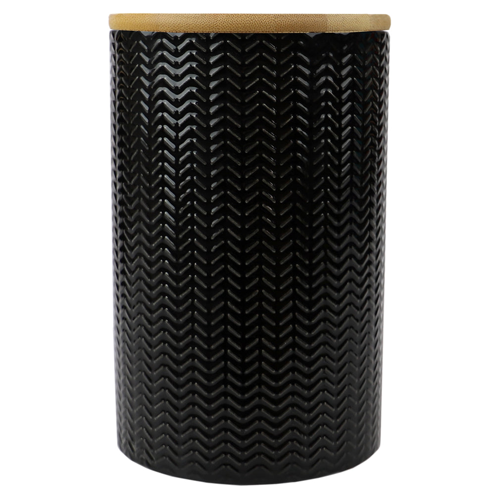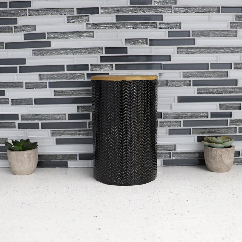 From pasta, flour, and spices to tea and coffee keep all your favorite pantry staples fresh and flavorful with this wave, textured patterned ceramic canister with bamboo lid. The wave design adds a touch of texture while its smooth finish makes it easy to wipe clean. The silicone ring keeps air out, creating an air-tight environment to keep contents dry and free insects. A must-have for any kitchen, it matches any type of interior décor. Hand wash. MATERIAL: Ceramic. SIZE: 5x5x7.75 Inches. COLOR: Black