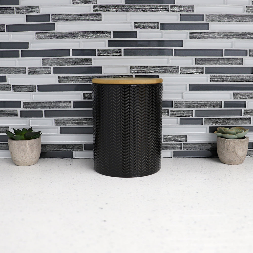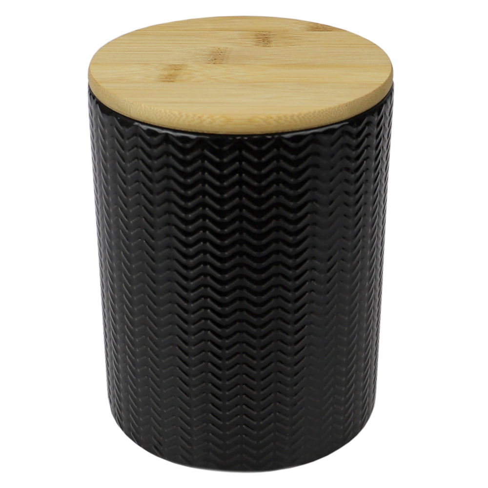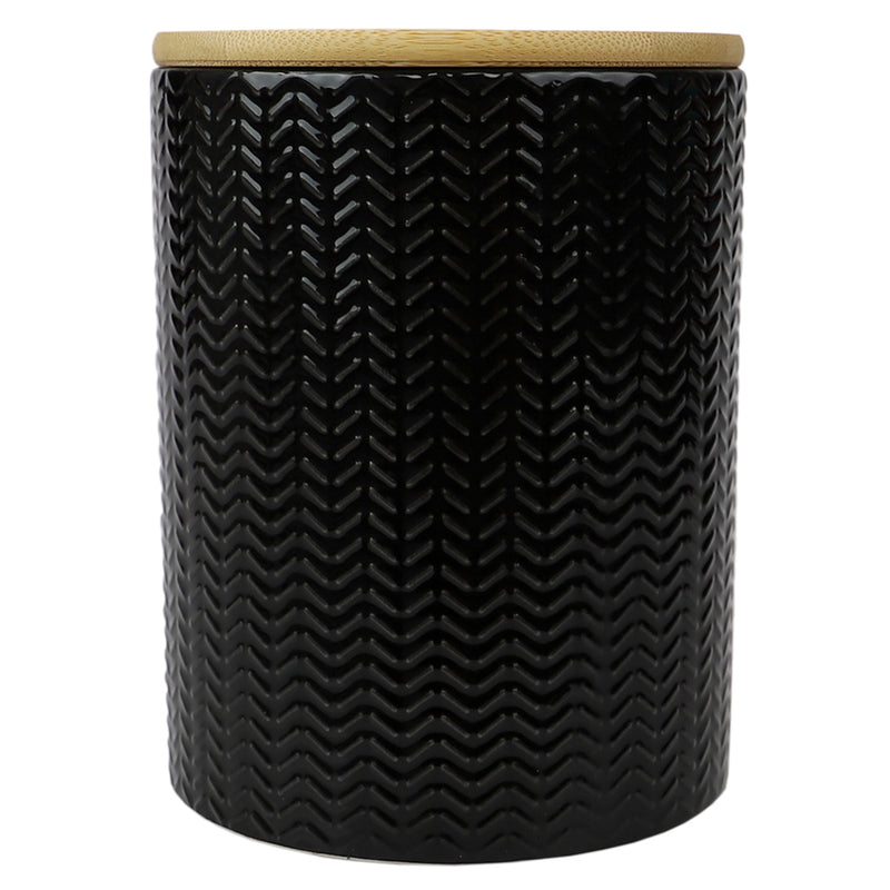 From pasta, flour, and spices to tea and coffee keep all your favorite pantry staples fresh and flavorful with this honeycomb patterned ceramic canister with bamboo lid. The wave design adds a touch of texture while its smooth finish makes it easy to wipe clean. The silicone ring keeps air out, creating an air-tight environment to keep contents dry and free insects. A must-have for any kitchen, it matches any type of interior décor. Hand wash. MATERIAL: Ceramic. SIZE: 5x5x6.5 Inches. COLOR: Black
