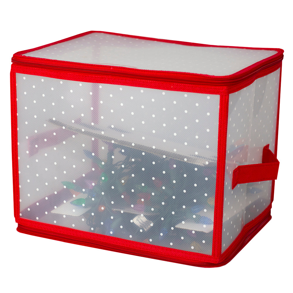 Preparing for the holidays can get stressful and with Christmas preparations come Christmas cleanups. Now you can say goodbye to heavy storage boxes that break or don’t hold your ornaments or Christmas lights, and hello to the Home Basics Zippered Christmas Light Organizer. This innovative storage cube is convenient for storage of all your Christmas tree ornaments, lights or decorations. You can be certain that it will keep your lights and ornaments safe and secure. You can use this storage cube for lights, ornaments, decorations and even crafts, sewing and art supplies. Finally, a place to keep all your colorful beloved yarn and important possessions. When this storage cube is not in use, it is fully collapsible to help you maximize your storage space. With its holiday-hued motif, every day will feel like Christmas morning, the minute you whip out this convenient storage box in a frosted polka-dot finish with red trim. The secure zipper closure allows you to easily unpack your ornaments effortlessly, while also ensuring dust and mites don't enter in. COLOR: Red. DIMENSIONS: 12.6x11x11 Inches.