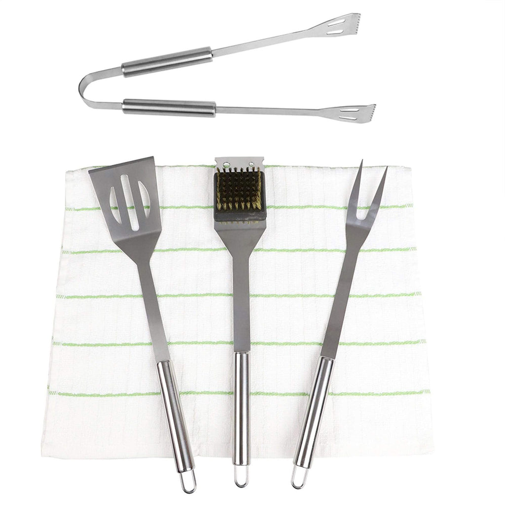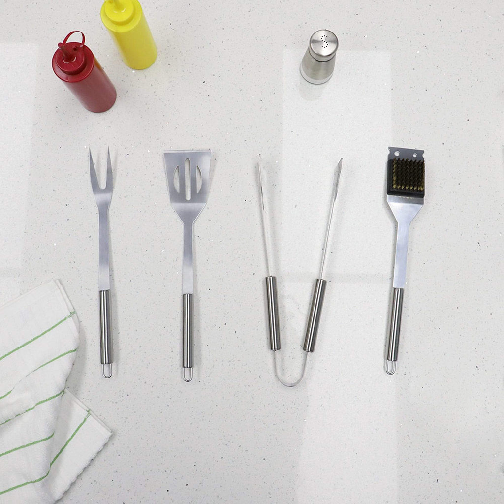 Become a master of the grill with this Homes Basics Stainless 4-Piece BBQ Tool Set. The set comes complete with bbq grill fork, bbq grill brush, bbq spatula, and bbq tongs. Item dimensions may differ slightly due to the unique nature of the product. Made from sturdy stainless steel each piece will not easily bend or break when flipping large chunks of meat. The handles are long enough to keep you at a safe distance from the grill. Use on a wide variety of grill types. The modern and functional design goes well with all types of décor. Whether you're grilling a juicy steak or flipping a stuffed burger, this set takes your grilling adventure to a whole new level. Perfect gift for the grill master in your life. Hand wash each piece with warm water and use gentle soap. Dry thoroughly after use. Color and finish may also differ from the images shown due to differences in monitor displays. Props and accessories are not included. MATERIAL: Stainless Steel. INCLUDES: (1) BBQ Grill Fork, (1) BBQ Grill Brush, (1) BBQ Spatula And (1) BBQ Tongs. COLOR: Silver