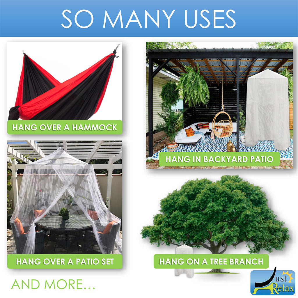 Create your own oasis inside your jumbo canopy by Just Relax. This indoor and outdoor mosquito net is perfect for decorating your space as well as keeping out those pesky bugs. Get the ULTIMATE BUG PROTECTION with an amazing 256 holes per square inch to prevent those unwanted bugs and pests from entering your domain. This Eco-Friendly mosquito net provides a natural a safe solution for protecting yourself and your loved ones against insects. The net instantly enhances your indoor and outdoor decor by providing a draped canopy over any space that you want! While being large in size you are able to use this net for your outside patio, backyard area and even camping. Creating the perfect cozy space anywhere without shutting out your surroundings! It’s versatile usage will make this your new favorite canopy set. Simply, drape the set over a play area to create a personal space for your little ones to enjoy leisure time. Add interest and charm to any outdoor space for ample space and comfort. The super-sized canopy ring measures 5 feet wide and drapes 9 feet down which is all the space you need to get the task done. To create a dramatic entryway on the canopy use the attached tieback and loops, perfect for play areas where you might want to create decorative look. This BEAUTIFULLY DESIGNED and VERSATILE canopy is perfect for every backyard and patio area, hammock, play area and kids room, or hang on a tree for camping! Something cool you can do with this is simply hang the canopy net to a tree and make your outdoor experience more enjoyable. Made with premium quality fabricated with the highest standards providing 100% polyester. The polyester fabric provides a the canopy to be stretched and is durable withstanding medium resistance on pulling. Update your indoor and outdoor decor with the Just Relax Outdoor and Indoor Mosquito Net. PACKAGE CONTAINS: one mosquito net, 2 Rods to create the ring, hoop and string. MEASUREMENTS: Ring 5 Ft x Canopy Height 9 Feet (152.4x274CM).