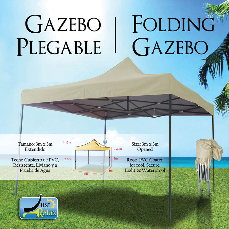 Just Relax folding gazebo canopy. Enjoy summer in the shade with this perfect PVC Coated folding gazebo canopy. Put a table and a few chairs under the canopy and have yourself a wonderful day! So it will be able to hold the whole family. Waterproof and PVC coated for roof. Size: 10 x 10 Feet. No assembly required. Color: Beige.