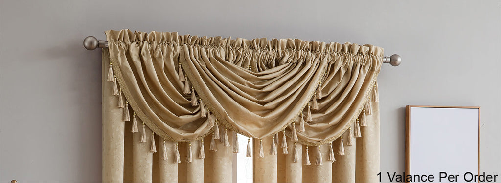 Kathryn Jacquard Leaf Design Window Panel And Valance Treatments, Gold