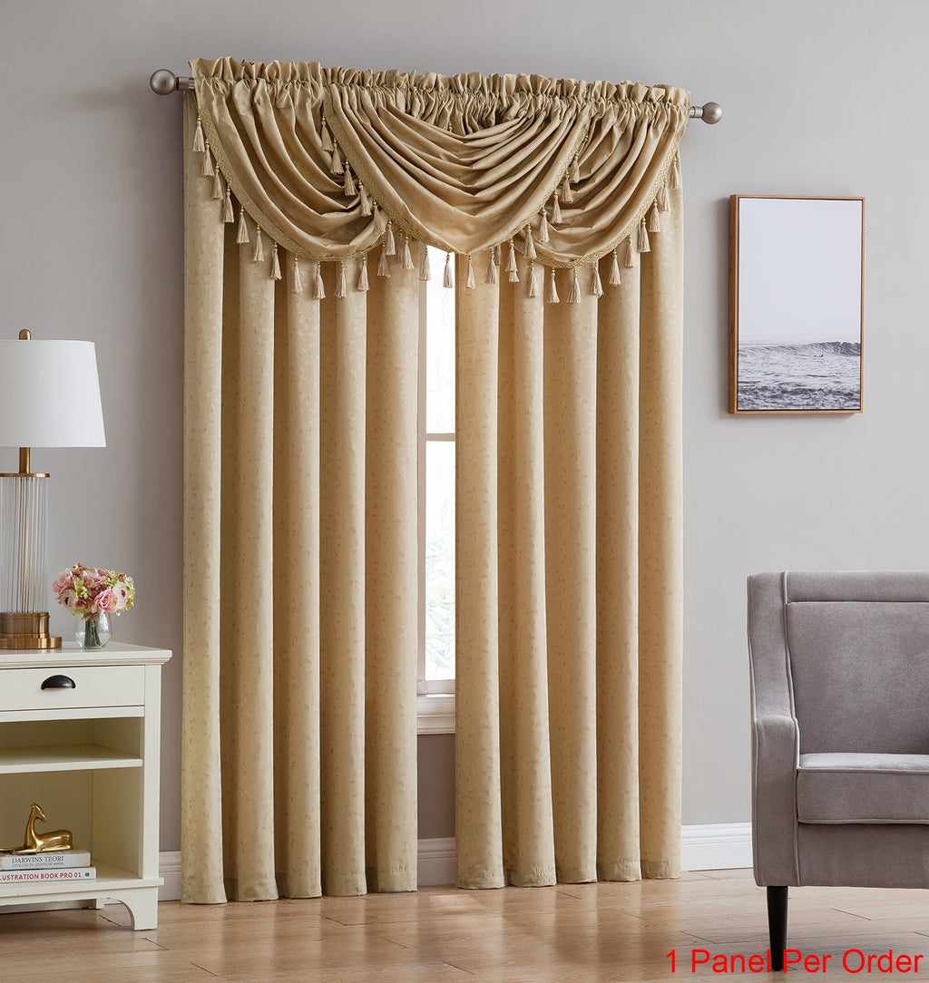 Transform the look of any room with the beautiful Kathryn Jacquard Leaf Design Rod Pocket Panel and valance. Add of touch of style and elegance to any window in your space. Effortlessly blending in with existing decor this panel will have everyone taking second glances. The leaf design adds a touch of fun, elegance and design. Featuring a leaf print design, the Kathryn valance will satisfy your tropical flare. Made of 100% Polyester this panel will look great in any setting. With a luxurious touch this panel fuses with a solid color with a unique design. Sure, to add an element of elegance and update your home’s decor! this lovely panel allows for easy hanging as it is a rod pocket panel, so any beautiful curtain rod can slide through in a breeze. Create excellence in your home by adding the Kathryn valance. Pair with the Kathryn Rod Pocket Waterfall Valance, sold separately. CARE: Machine wash cold, gentle cycle. COLOR: Gold. Panel PACKAGE CONTAINS: Picture shows 2, Package contains 1. DIMENSIONS: 54x84 Inches. Valance PACKAGE CONTAINS: 1 Valance. DIMENSIONS: 48x37 Inches.