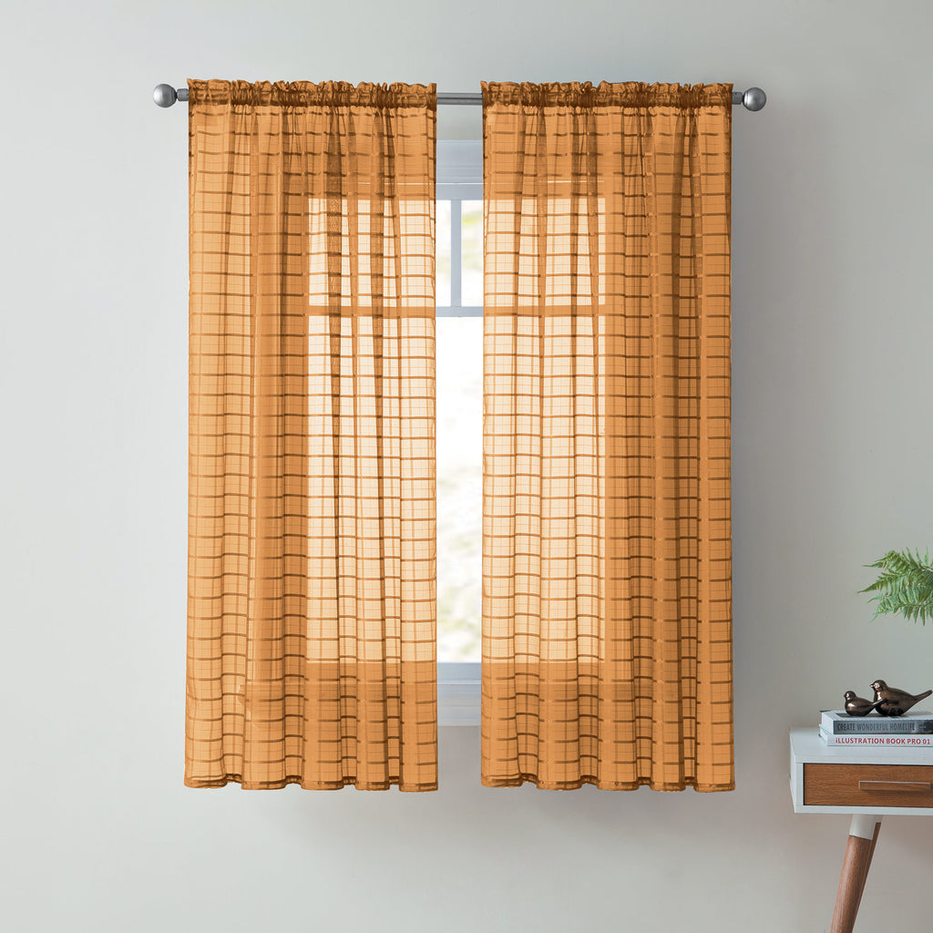 Transform and add style to any bedroom, dining room or family room with the Lisa Plaid Sheer Rod Pocket Panel by Victoria Classics. These beautiful sheer curtains are an easy and inexpensive way to add fashion and function to your home. Featuring a Gold plaid design that has a soft shine, these panels are perfect for giving a distinctive and modern accent to any decor any room in your home! Not only will they look nice, but they will provide you both light and privacy without compromise. The rod pocket header makes installation a breeze! Just slide any beautiful curtain rod through and enjoy the look of your new and improved room. Pictures show two, package contains one. COLOR: Gold. DIMENSIONS: 55x63 Inches.